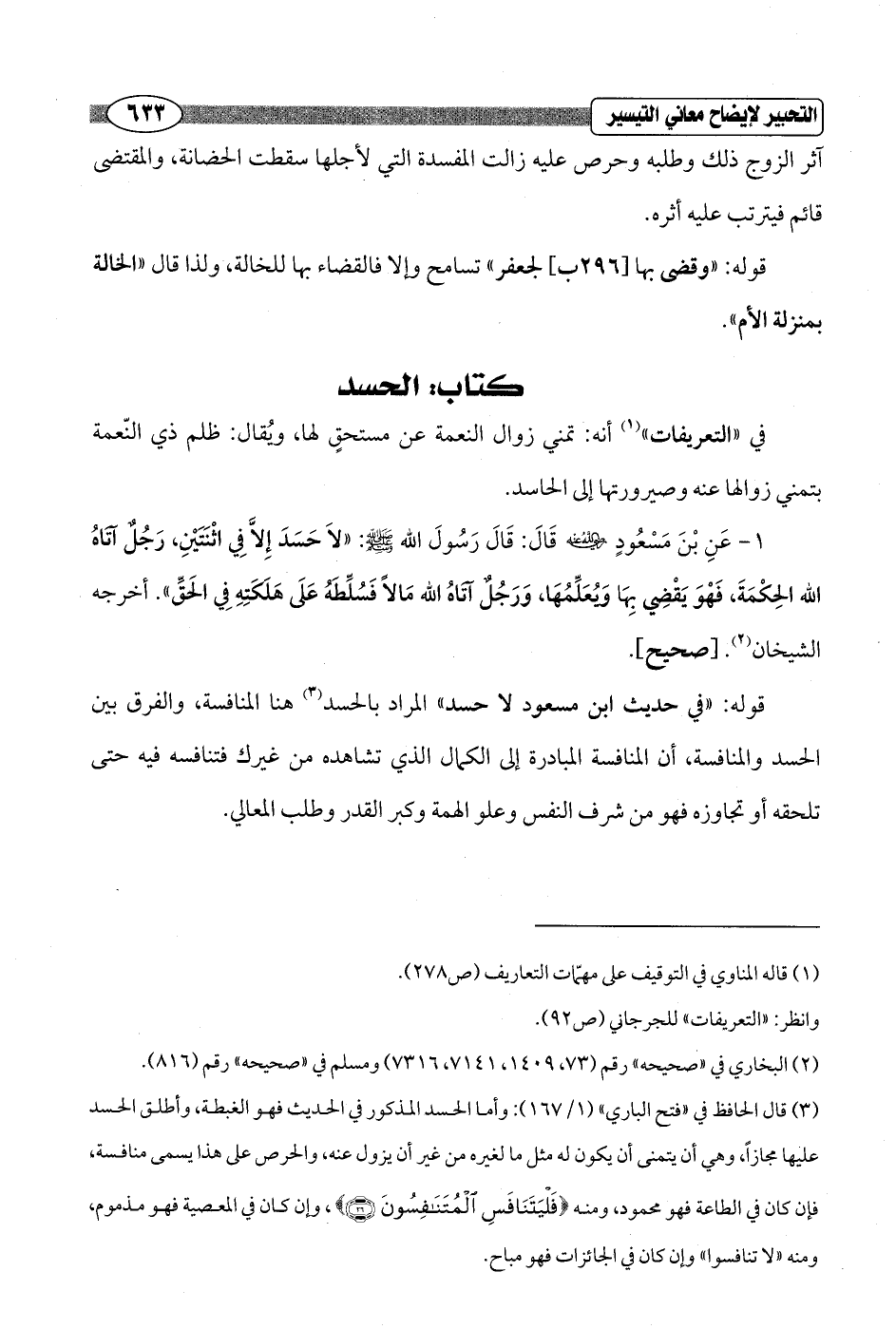 في "التعريفات" (¬1) أنه: تمني زوال النعمة عن مستحقٍ لها، ويُقال: ظلم ذي النّعمة بتمني زوالها عنه وصيرورتها إلى الحاسد.