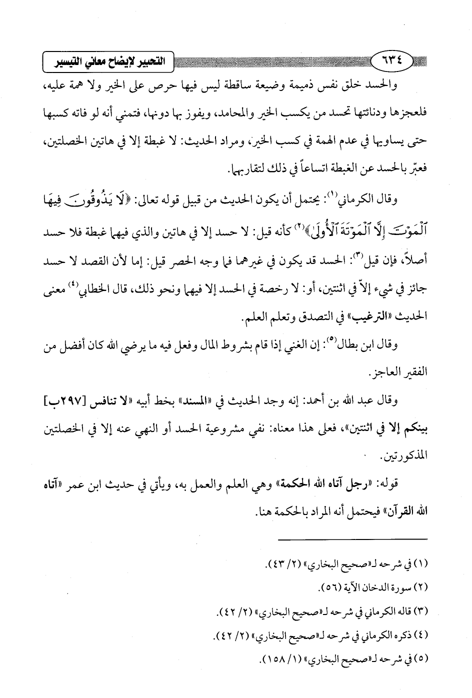 وقال الكرماني (¬1): يحتمل أن يكون الحديث من قبيل قوله تعالى: {لَا يَذُوقُونَ فِيهَا الْمَوْتَ إِلَّا الْمَوْتَةَ الْأُولَى} (¬2) كأنه قيل: لا حسد إلا في هاتين والذي فيهما غبطة فلا حسد أصلاً، فإن قيل (¬3): الحسد قد يكون في غيرهما فما وجه الحصر قيل: إما لأن القصد لا حسد جائز في شيء إلاّ في اثنتين، أو: لا رخصة في الحسد إلا فيهما ونحو ذلك، قال الخطابي (¬4) معنى الحديث "الترغيب" في التصدق وتعلم العلم.