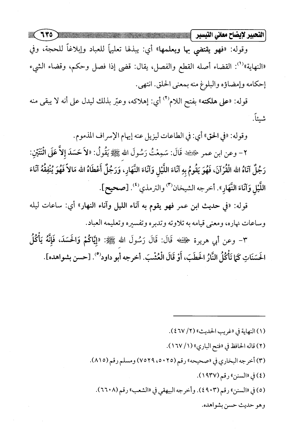 2 - وعن ابن عمر - رضي الله عنهما - قَالَ: سَمِعْتُ رَسُولَ اللهِ - صلى الله عليه وسلم - يَقُولُ: "لاَ حَسَدَ إِلاَّ عَلَى اثْنَتَيْن: رَجُلٌ آتَاهُ الله الْقُرْآنَ، فَهُوَ يَقُومُ بِهِ آنَاءَ اللَّيْلِ وَآنَاءَ النَّهَارِ، وَرَجُل أَعْطَاهُ الله مَالاً فَهُوَ يُنْفِقُهُ آنَاءَ اللَّيْلِ وَآنَاءَ النَّهَارِ". أخرجه الشيخان (¬3) والترمذي (¬4). [صحيح].