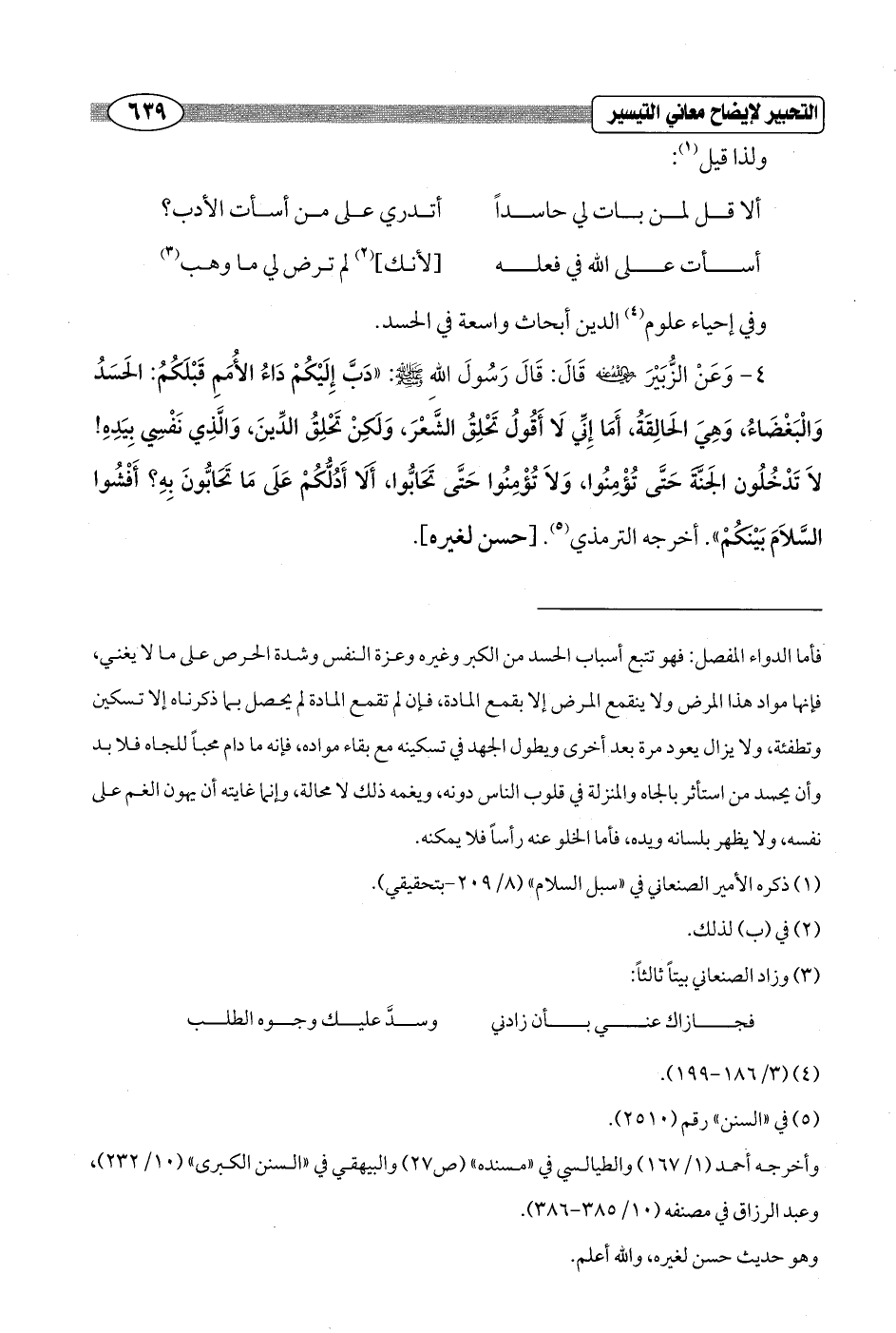 4 - وَعَنْ الزُّبَيْرَ - رضي الله عنه - قَالَ: قَالَ رَسُولَ الله - صلى الله عليه وسلم -: "دَبَّ إِلَيْكُمْ دَاءُ الأُمَمِ قَبْلكُمُ: الحَسَدُ وَالْبَغْضَاءُ، وَهِيَ الحَالِقَةُ، أَمَا إِنِّي لَا أَقُولُ تَحْلِقُ الشَّعْرَ، وَلَكِنْ تَحْلِقُ الدِّينَ، وَالَّذِي نَفْسِي بِيَدِهِ! لاَ تَدْخُلُون الجَنَّةَ حَتَّى تُؤْمِنُوا، وَلاَ تُؤْمِنُوا حَتَّى تَحَابُّوا، أَلا أَدُلُّكُمْ عَلَى مَا تَحَابُّونَ بِهِ؟ أَفْشُوا السَّلاَمَ بَيْنَكُمْ". أخرجه الترمذي (¬5). [حسن لغيره].