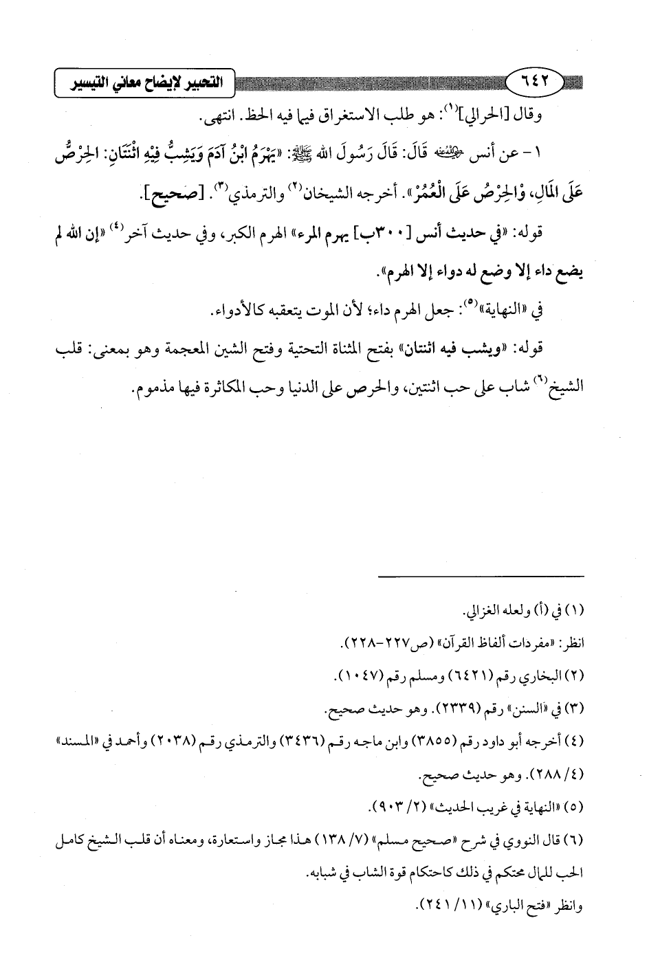 (¬6) قال النووي في شرح "صحيح مسلم" (7/ 138) هذا مجاز واستعارة, ومعناه أن قلب الشيخ كامل الحب للمال محتكم في ذلك كاحتكام قوة الشاب في شبابه.