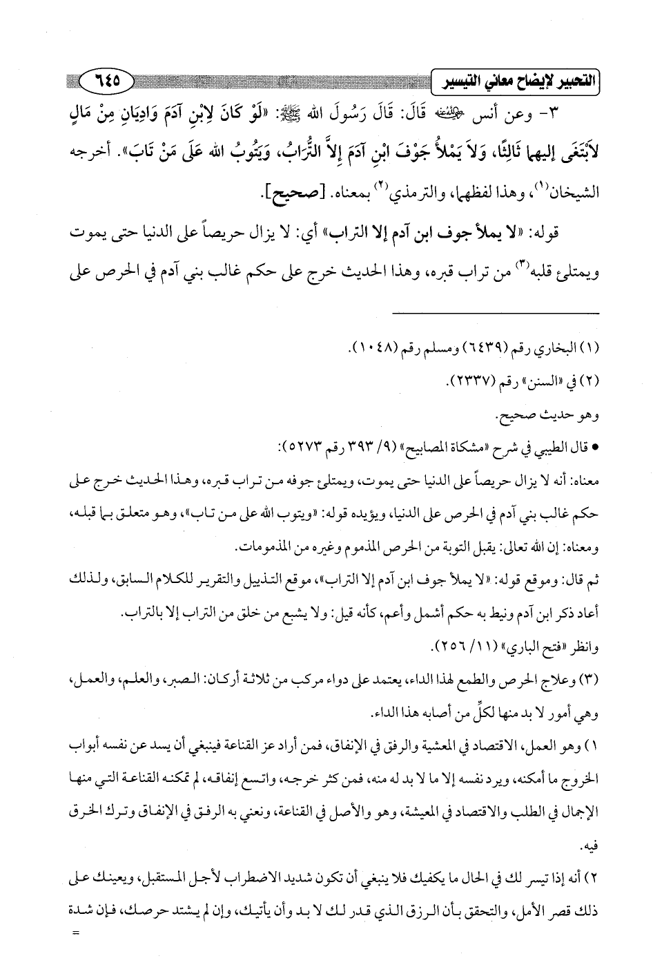 3 - وعن أنس - رضي الله عنه - قَالَ: قَالَ رَسُولَ الله - صلى الله عليه وسلم -: "لَوْ كَانَ لِابْنِ آدَمَ وَادِيَانِ مِنْ مَالٍ لاَبْتَغَى إليهما ثَالِثًا، وَلاَ يَمْلأُ جَوْفَ ابْنِ آدَمَ إِلاَّ التُّرَابُ، وَيَتُوبُ الله عَلَى مَنْ تَابَ". أخرجه الشيخان (¬1)، وهذا لفظهما، والترمذي (¬2) بمعناه. [صحيح].