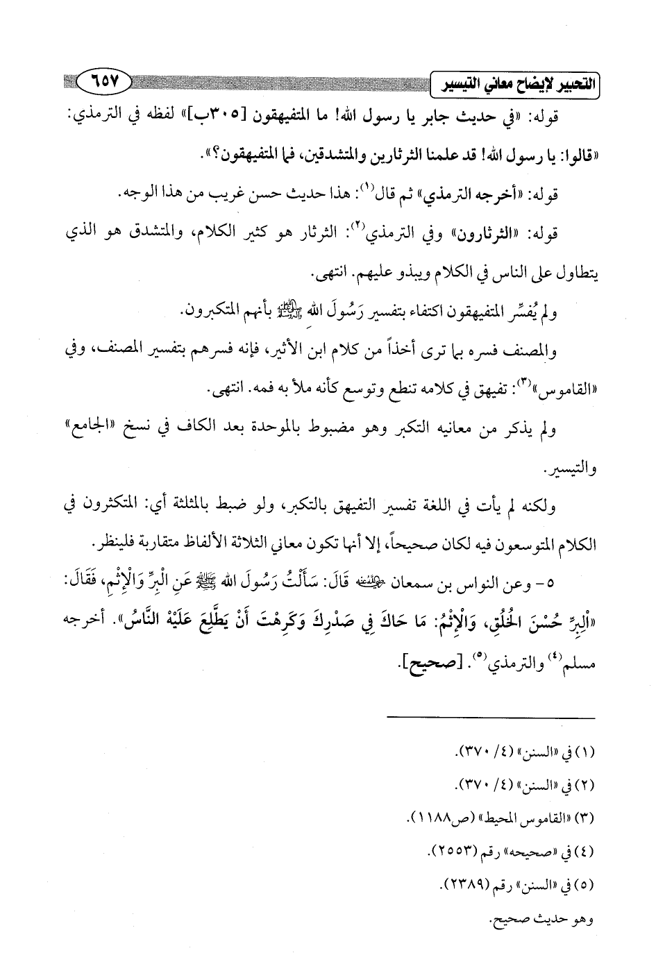 ولكنه لم يأت في اللغة تفسير التفيهق بالتكبر، ولو ضبط بالمثلثة أي: المتكثرون في الكلام المتوسعون فيه لكان صحيحاً، إلا أنها تكون معاني الثلاثة الألفاظ متقاربة فلينظر.