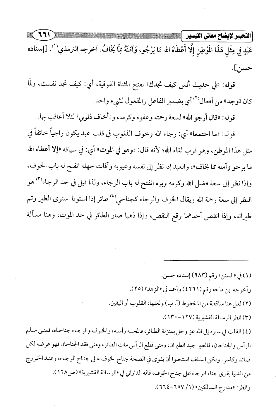 (¬4) القلب في سيره إلى الله عز وجل بمنزلة الطائر، فالمحبة رأسه, والخوف والرجاء جناحاه, فمتى سلم الرأس والجناحان، فالطير جيد الطيران، ومتى قطع الرأس مات الطائر، ومتى فقد الجناحان فهو عرضه لكل صائد وكاسر. ولكن السلف استحبوا أن يقوى في الصحة جناح الخوف على جناح الرجاء، وعند الخروج من الدنيا يقوى جناح الرجاء على جناح الخوف، قاله الداراني في "الرسالة القشيرية" (ص 128).
