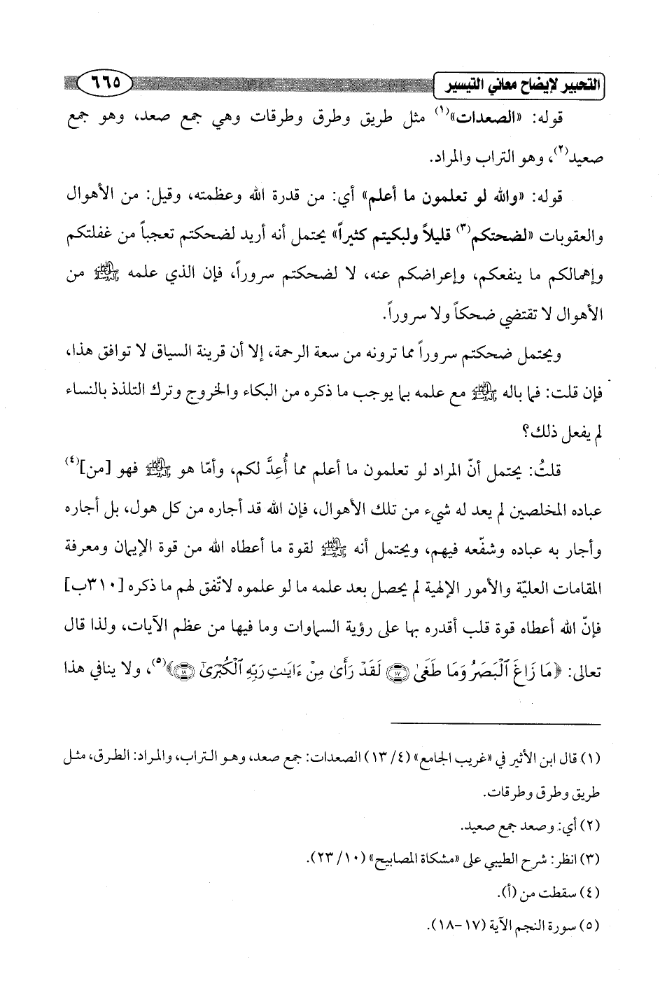 قلتُ: يحتمل أنّ المراد لو تعلمون ما أعلم مما أُعِدَّ لكم، وأمّا هو - صلى الله عليه وسلم - فهو [من] (¬4) عباده المخلصين لم يعد له شيء من تلك الأهوال، فإن الله قد أجاره من كل هول، بل أجاره وأجار به عباده وشفّعه فيهم، ويحتمل أنه - صلى الله عليه وسلم - لقوة ما أعطاه الله من قوة الإيمان ومعرفة المقامات العليّة والأمور الإلهية لم يحصل بعد علمه ما لو علموه لاتّفق لهم ما ذكره [310 ب] فإنّ الله أعطاه قوة قلب أقدره بها على رؤية السماوات وما فيها من عظم الآيات، ولذا قال تعالى: {مَا زَاغَ الْبَصَرُ وَمَا طَغَى (17) لَقَدْ رَأَى مِنْ آيَاتِ رَبِّهِ الْكُبْرَى (18)} (¬5)، ولا ينافي هذا