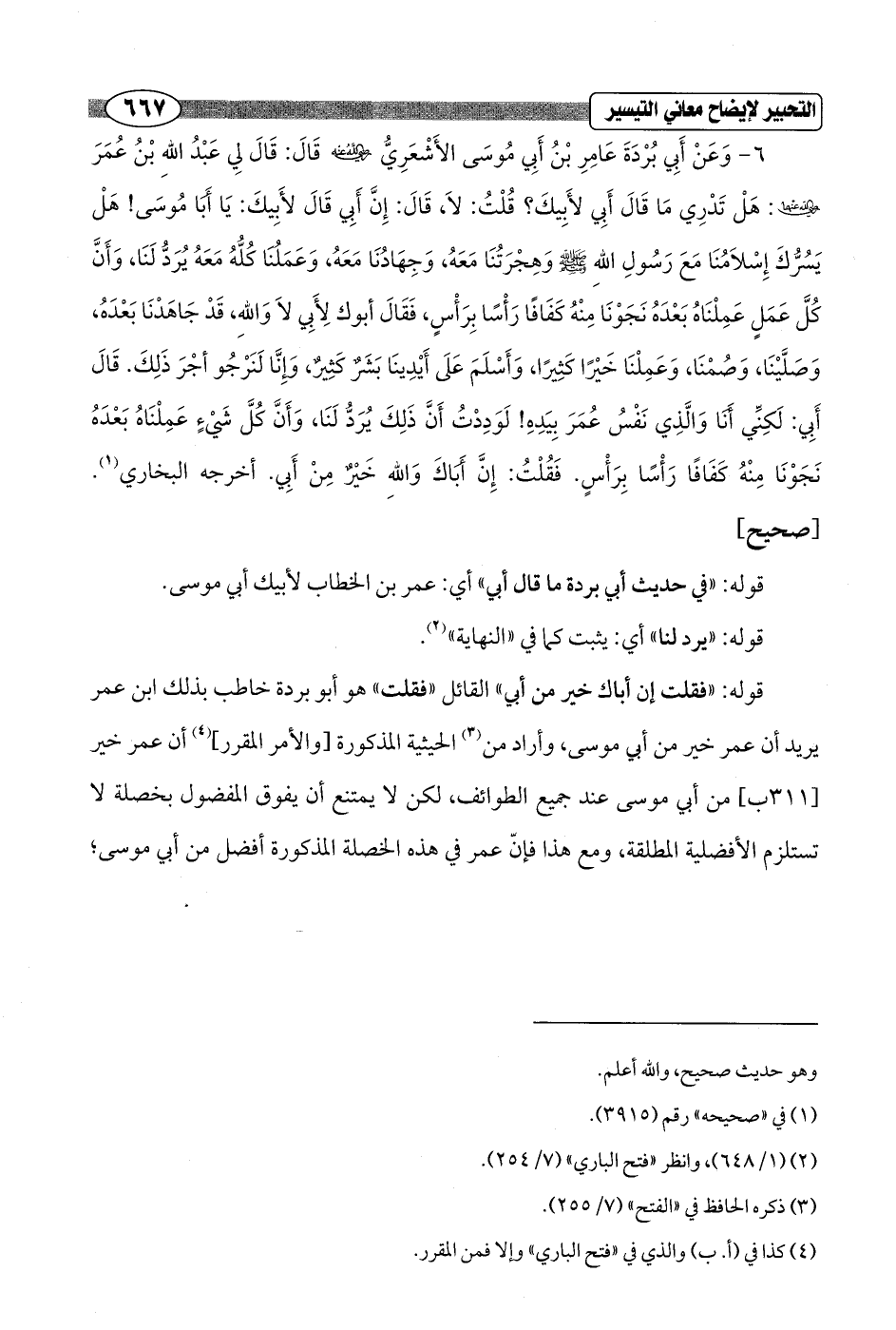 قوله: "فقلت إن أباك خير من أبي" القائل "فقلت" هو أبو بردة خاطب بذلك ابن عمر يريد أن عمر خير من أبي موسى، وأراد من (¬3) الحيثية المذكورة [والأمر المقرر] (¬4) أن عمر خير [311 ب] من أبي موسى عند جميع الطوائف، لكن لا يمتنع أن يفوق المفضول بخصلة لا تستلزم الأفضلية المطلقة, ومع هذا فإنّ عمر في هذه الخصلة المذكورة أفضل من أبي موسى؛