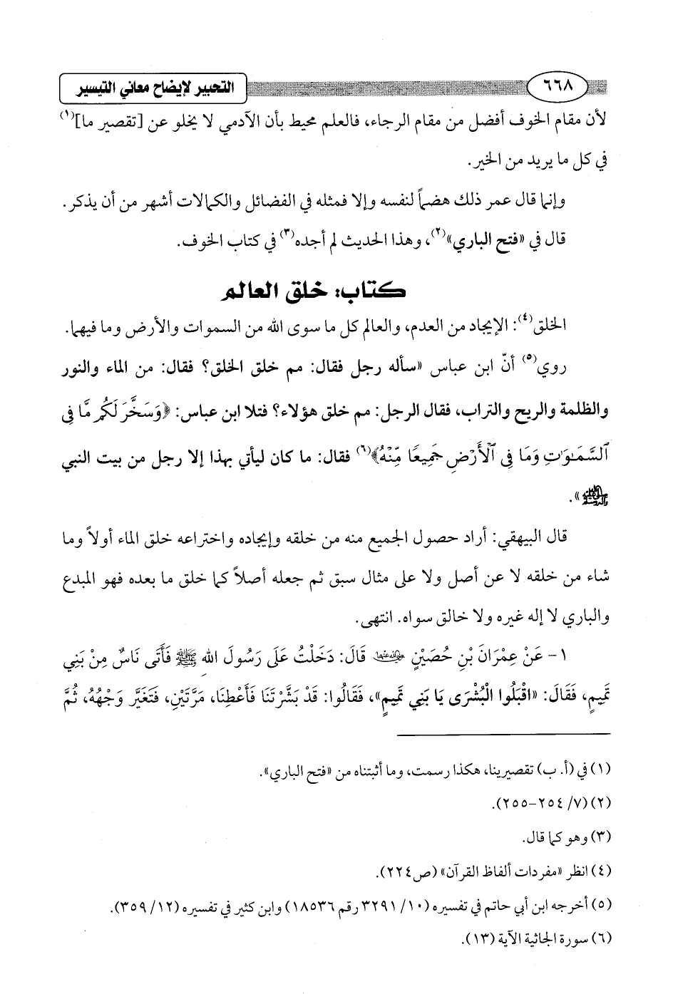 الخلق (¬4): الإيجاد من العلم، والعالم كل ما سوى الله من السموات والأرض وما فيهما.