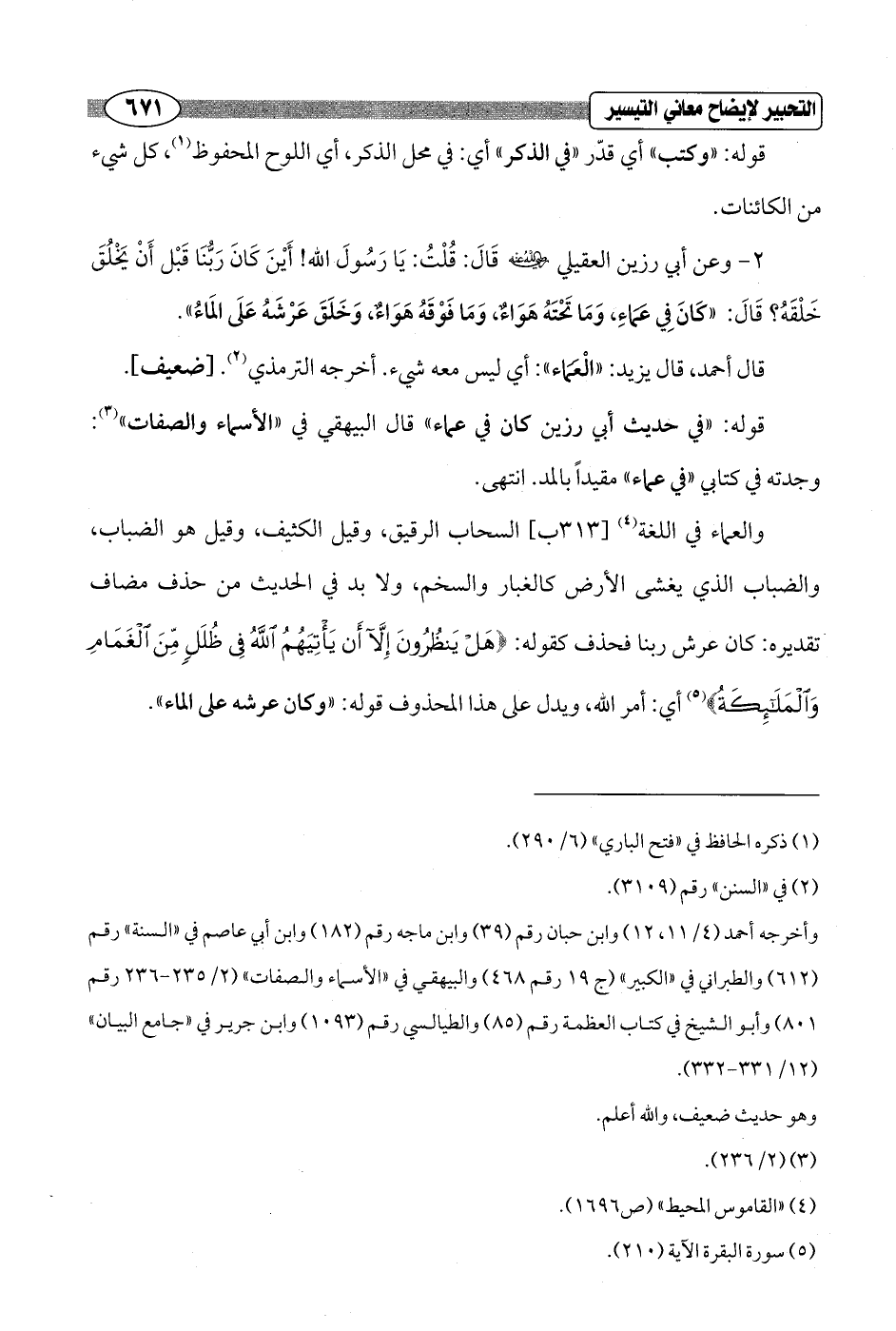 2 - وعن أبي رزين العقيلي - رضي الله عنه - قَالَ: قُلْتُ: يَا رَسُولَ الله! أَيْنَ كَانَ رَبُّنَا قَبْل أَنْ يَخْلُقَ خَلْقَهُ؟ قَالَ: "كَانَ فِي عَمَاءِ، وَمَا تَحْتَهُ هَوَاءٌ، وَمَا فَوْقَهُ هَوَاءٌ، وَخَلَقَ عَرْشَهُ عَلَى المَاءُ".