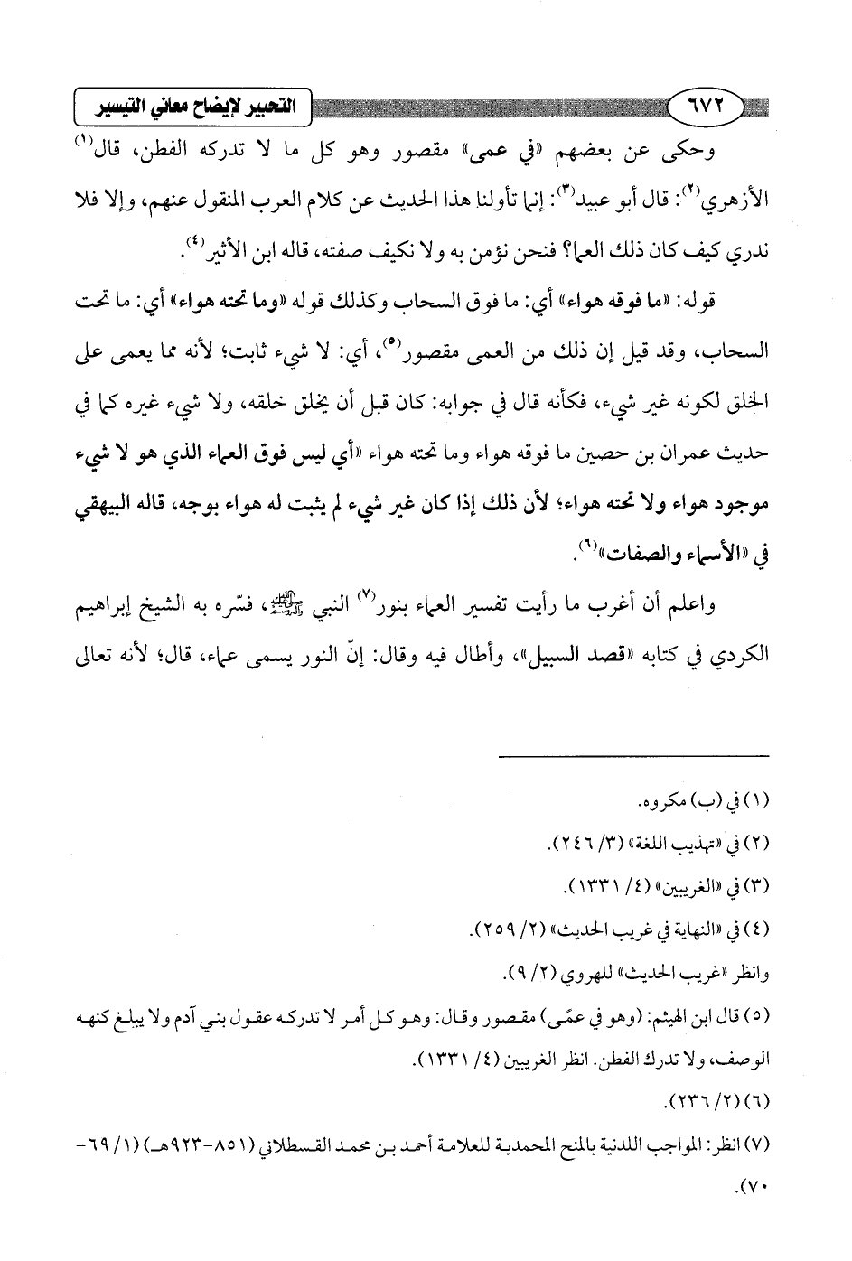 واعلم أن أغرب ما رأيت تفسير العماء بنور (¬7) النبي - صلى الله عليه وسلم -، فسّره به الشيخ إبراهيم الكردي في كتابه "قصد السبيل"، وأطال فيه وقال: إنّ النور يسمى عماء، قال؛ لأنه تعالى