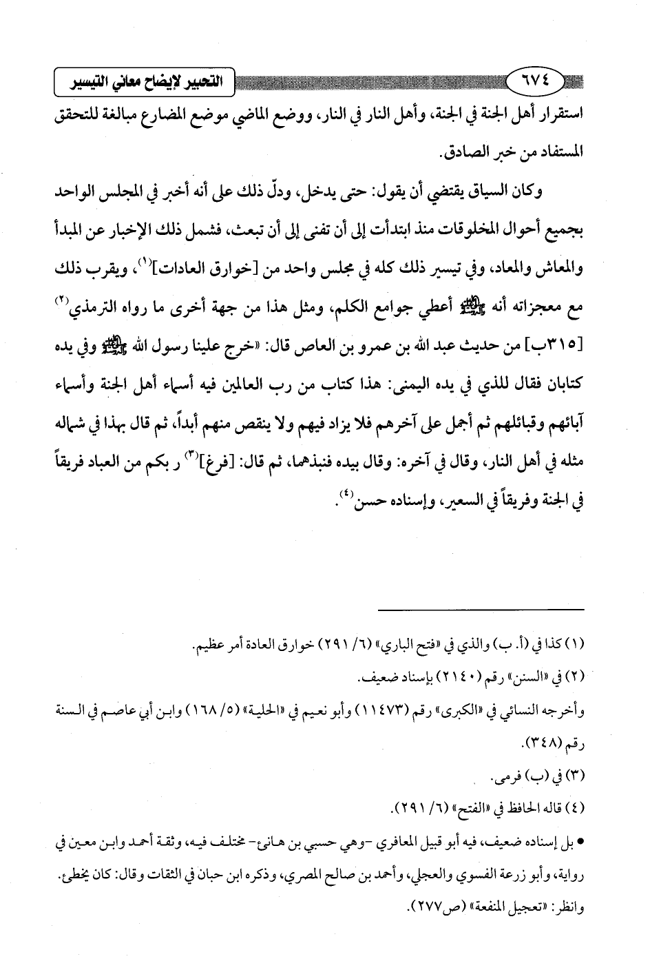 وكان السياق يقتضي أن يقول: حتى يدخل، ودلّ ذلك على أنه أخبر في المجلس الواحد بجميع أحوال المخلوقات منذ ابتدأت إلى أن تفنى إلى أن تبعث، فشمل ذلك الإخبار عن المبدأ والمعاش والمعاد، وفي تيسير ذلك كله في مجلس واحد من [خوارق العادات] (¬1)، ويقرب ذلك مع معجزاته أنه - صلى الله عليه وسلم - أعطي جوامع الكلم، ومثل هذا من جهة أخرى ما رواه الترمذي (¬2) [315 ب] من حديث عبد الله بن عمرو بن العاص قال: "خرج علينا رسول الله - صلى الله عليه وسلم - وفي يده كتابان فقال للذي في يده اليمنى: هذا كتاب من رب العالمين فيه أسماء أهل الجنة وأسماء آبائهم وقبائلهم ثم أجل على آخرهم فلا يزاد فيهم ولا ينقص منهم أبداً، ثم قال بهذا في شماله مثله في أهل النار، وقال في آخره: وقال بيده فنبذهما، ثم قال: [فرغ] (¬3) ربكم من العباد فريقاً في الجنة وفريقاً في السعير، وإسناده حسن (¬4).