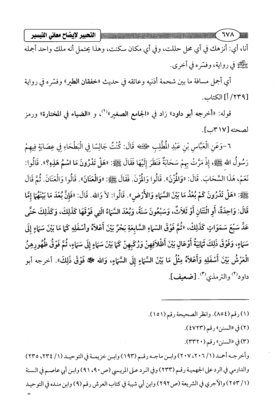 6 - وَعَنِ الْعَبَّاسِ بْنِ عَبْدِ المُطَّلِبِ - رضي الله عنه - قَالَ: كُنْتُ جَالِسًا فِي الْبَطْحَاءِ فِي عِصَابَةٍ فِيهِمْ رَسُولُ اللهِ - صلى الله عليه وسلم -، إِذْ مَرَّتْ بِهِمْ سَحَابَةٌ فَنَظَرَ إِلَيْهَا فَقَالَ - صلى الله عليه وسلم -: "هَلْ تَدْرُونَ مَا اسْمُ هَذِهِ؟ ". قَالُوا: نَعَمْ، هَذَا السَّحَابَ. قَالَ: "وَالمُزْنَ". قَالُوا وَالمُزْنَ. فَقَالَ - صلى الله عليه وسلم -: "وَالْعَنَانَ". قَالُوا وَالْعَنَانَ. ثُمَّ قَالَ - صلى الله عليه وسلم -: "هَلْ تَدْرُونَ كَمْ بُعْدُ مَا بَيْنَ السَّمَاءِ وَالأَرْضِ". قَالُوا: لاَ وَالله. قَالَ: "فَإِنَّ بُعْدَ مَا بَيْنَهُمَا إِمَّا قَالَ: وَاحِدَةٌ، أَوِ اثْنَتَانِ أَوْ ثَلاَثٌ، وَسَبْعُونَ سَنَةً, وَبُعْدَ السَّمَاءُ الَتِي فَوْقَهَا كَذَلِكَ، وَكَذَلِكَ حَتَّى عَدَّ سَبْعَ سَمَوَاتٍ كَذَلِكْ، "ثُمَّ فَوْقَ السّماءِ السَّابِعَةِ بَحْرٌ بَيْنَ أَعْلاَهُ وأسْفَلِهِ كَمَا مَا بَيْنَ سَمَاءٍ إِلَى سَمَاءٍ، وَفَوْقَ ذَلِكَ ثَمَانِيَةُ أَوْعَالٍ بَيْنَ أَظْلاَفِهِنْ وَرُكَبِهِنْ كَمَا بَيْنَ سَمَاءٍ إِلَى سَمَاءٍ، ثُمَّ فَوْقُ ظُهُورِهِنُ الْعَرْشُ بَيْنَ أَسْفَلِهِ وَأَعْلاَهُ مِثْلُ مَا بَيْنَ السَّمَاءٍ إِلَى السَّمَاءٍ، وَالله - عز وجل - فَوْقَ ذَلِكَ". أخرجه أبو داود (¬2) والترمذي (¬3). [ضعيف].
