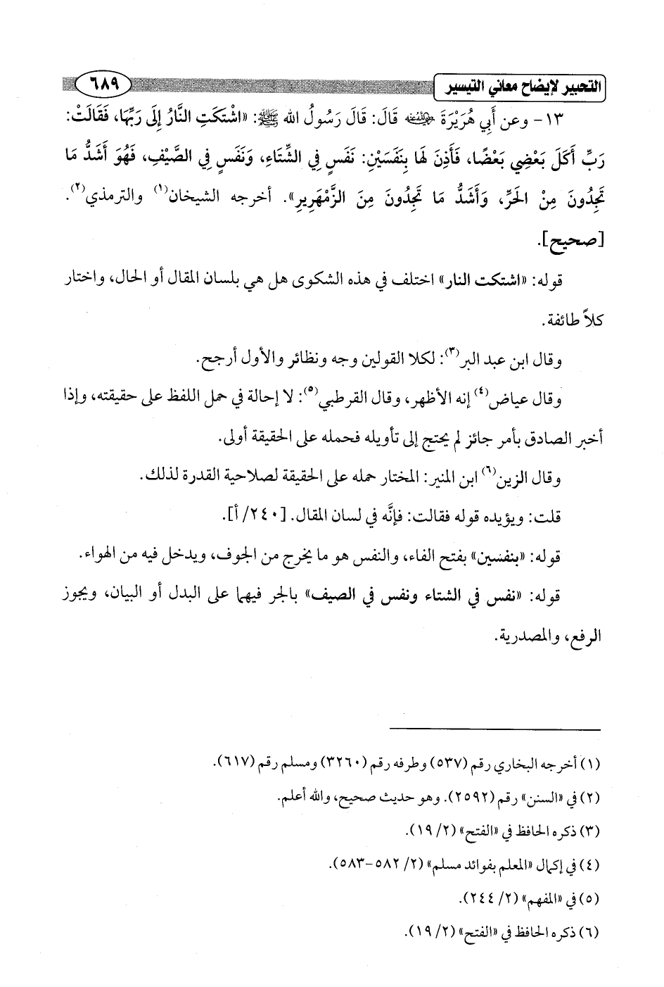 13 - وعن أَبِي هُرَيْرَةَ - رضي الله عنه - قَالَ: قَالَ رَسُولُ الله - صلى الله عليه وسلم -: "اشْتَكَتِ النَّارُ إِلَى رَبِّهَا، فَقَالَتْ: رَبِّ أَكَلَ بَعْضِي بَعْضًا، فَأَذِنَ لهَا بِنَفَسَيْنِ: نَفَسٍ فِي الشِّتَاءِ، وَنَفَسٍ فِي الصَّيْفِ، فَهُوَ أَشَدُّ مَا تَجِدُونَ مِنْ الحَرِّ، وَأَشَدُّ مَا تَجِدُونَ مِنَ الزَّمْهَرِيرِ". أخرجه الشيخان (¬1) والترمذي (¬2). [صحيح].