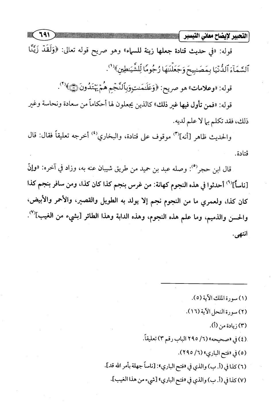قوله: "في حديث قتادة جعلها زينة للسماء" وهو صريح قوله تعالى: {وَلَقَدْ زَيَّنَّا السَّمَاءَ الدُّنْيَا بِمَصَابِيحَ وَجَعَلْنَاهَا رُجُومًا لِلشَّيَاطِينِ} (¬1).