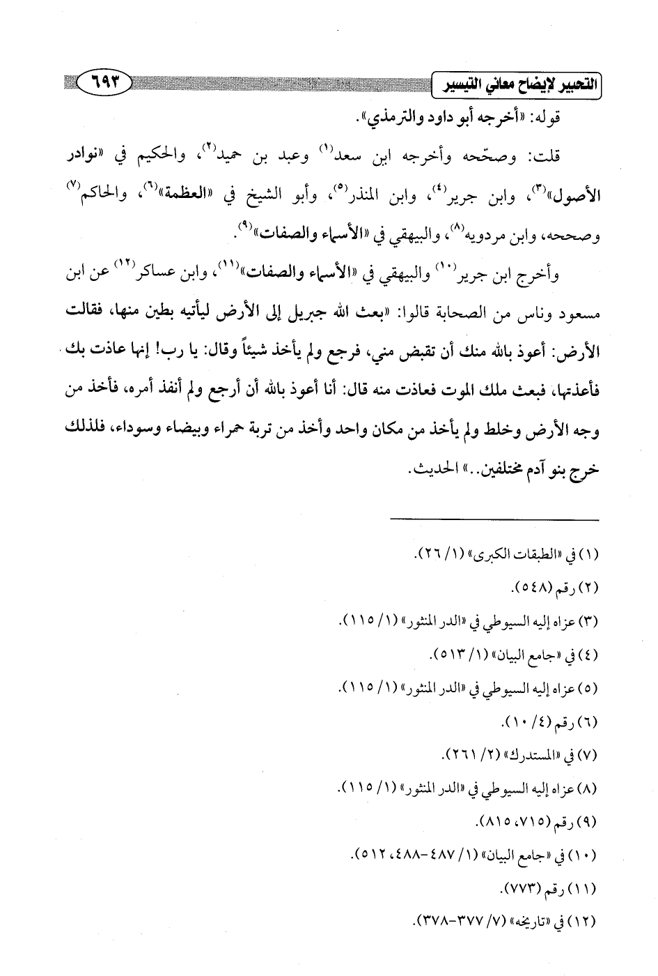 قلت: وصحّحه وأخرجه ابن سعد (¬1) وعبد بن حميد (¬2)، والحكيم في "نوادر الأصول" (¬3)، وابن جرير (¬4)، وابن المنذر (¬5)، وأبو الشيخ في "العظمة" (¬6)، والحاكم (¬7) وصححه، وابن مردويه (¬8)، والبيهقي في "الأسماء والصفات" (¬9).