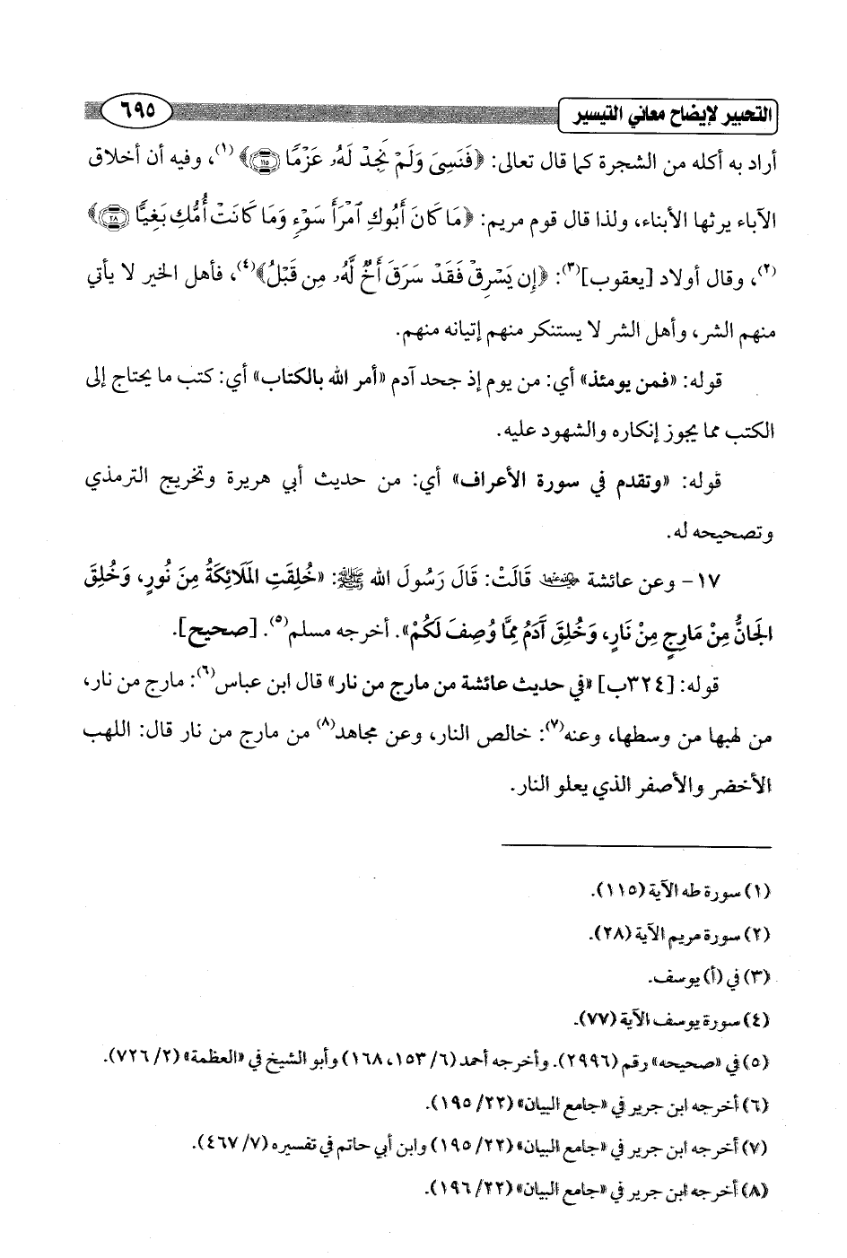 17 - وعن عائشة - رضي الله عنها - قَالَتْ: قَالَ رَسُولَ الله - صلى الله عليه وسلم -: "خُلِقَتِ المَلَائِكَةُ مِنَ نُورٍ، وَخُلِقَ الجَانُّ مِنْ مَارِجٍ مِنْ نَارٍ، وَخُلِقَ آَدَمُ مِمَّا وُصِفَ لَكُمْ". أخرجه مسلم (¬5). [صحيح].