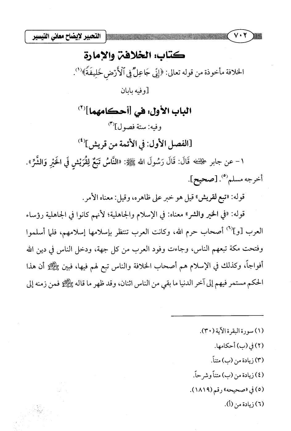 1 - عن جابر - رضي الله عنه - قَالَ: قَالَ رَسُولَ الله - صلى الله عليه وسلم -: "النَّاسُ تَبَعٌ لِقُرَيْشٍ فَي الخَيْرِ وَالشَّرِّ". أخرجه مسلم (¬5). [صحيح].