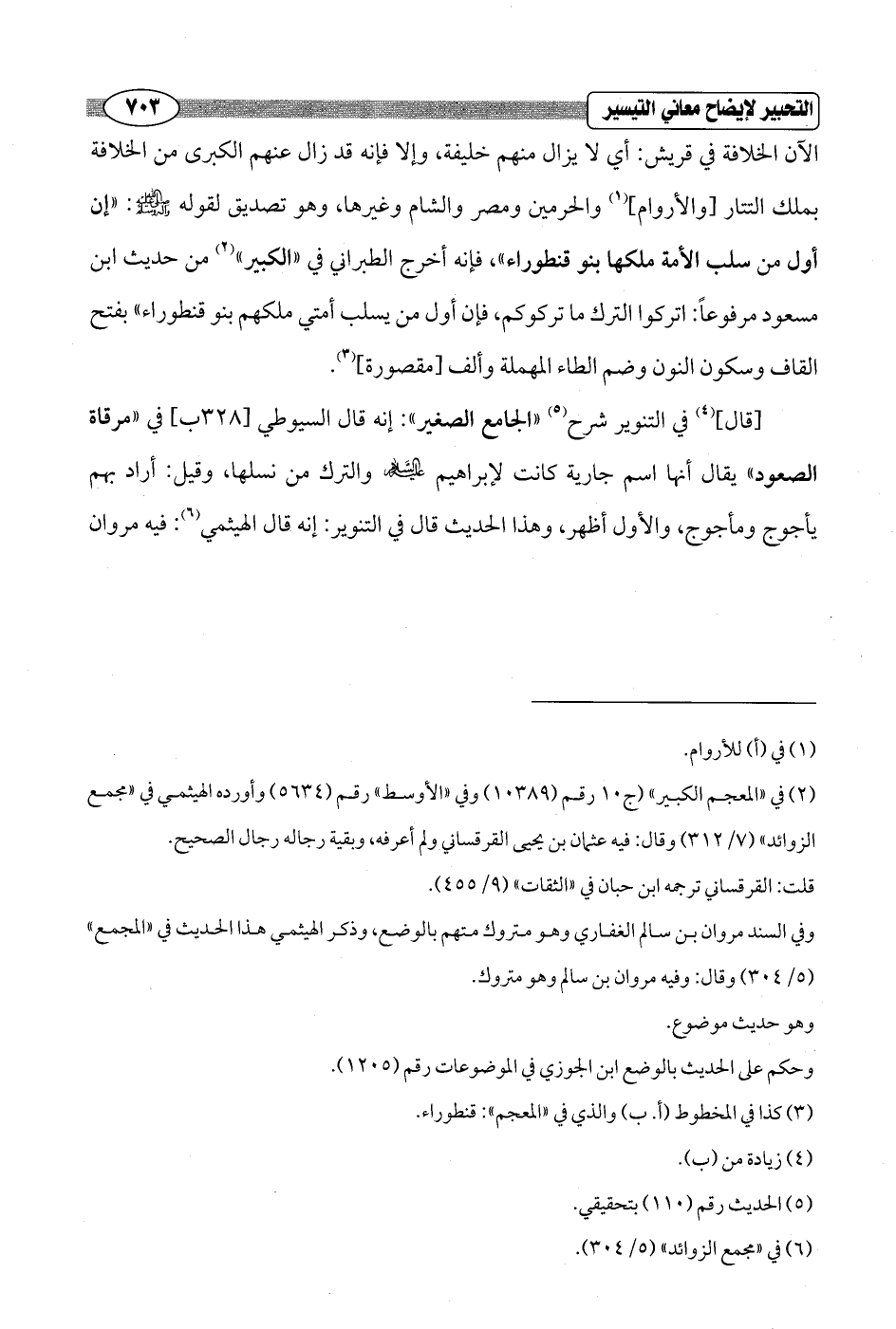 [قال] (¬4) في التنوير شرح (¬5) "الجامع الصغير": إنه قال السيوطي [328 ب] في "مرقاة الصعود" يقال أنها اسم جارية كانت لإبراهيم - عليه السلام - والترك من نسلها، وقيل: أراد بهم يأجوج ومأجوج، والأول أظهر، وهذا الحديث قال في التنوير: إنه قال الهيثمي (¬6): فيه مروان