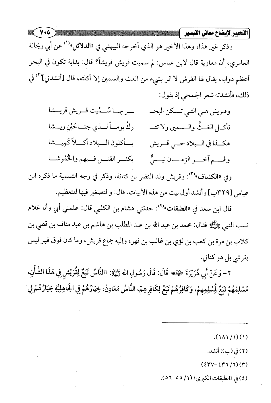 وذكر غير هذا، وهذا الأخير هو الذي أخرجه البيهقي في "الدلائل" (¬1) عن أبي ريحانة العامري، أن معاوية قال لابن عباس: لم سميت قريش قريشاً؟ قال: بدابة تكون في البحر أعظم دوابه، يقال لها القرش لا تمر بشيء من الغث والسمين إلا أكلته، قال [أنشدني] (¬2) في ذلك، فأنشدته شعر الجمحي إذ يقول: