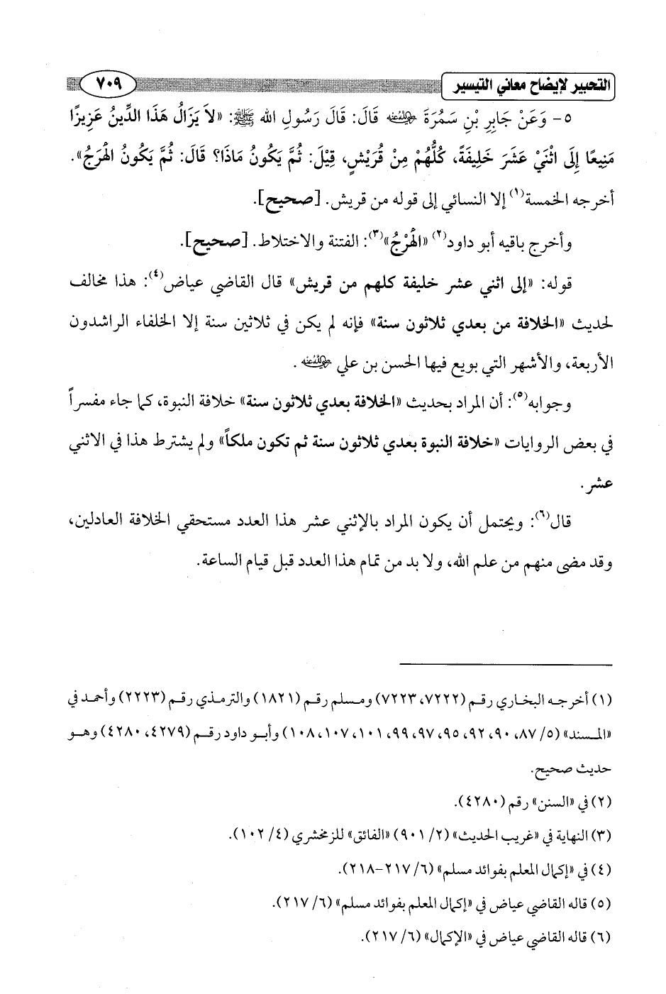 5 - وَعَنْ جَابِرِ بْنِ سَمُرَةَ - رضي الله عنه - قَالَ: قَالَ رَسُولِ الله - صلى الله عليه وسلم -: "لاَ يَزَالُ هَذَا الدِّينُ عَزِيزًا مَنِيعًا إِلَى اثْنَيْ عَشَرَ خَلِيفَةً كُلُّهُمْ مِنْ قُرَيْشٍ، قِيْلَ: ثُمَّ يَكُونُ مَاذَا؟ قَالَ: ثُمَّ يَكُونُ الهْرَجُ". أخرجه الخمسة (¬1) إلا النسائي إلى قوله من قريش. [صحيح].