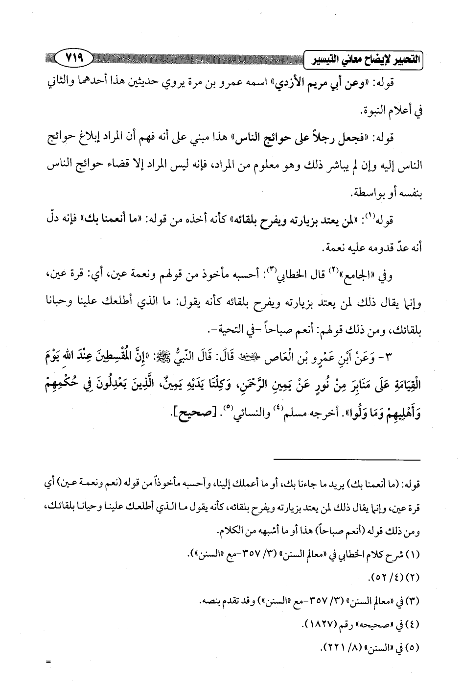 3 - وَعَنْ اَبْنِ عَمْرٍو بْن الْعَاص - رضي الله عنهما - قَالَ: قَالَ النّبيُّ - صلى الله عليه وسلم -: "إِنَّ المُقْسِطِينَ عِنْدَ اللهِ يَوْمَ الْقِيَامَةِ عَلَى مَنَابِرَ مِنْ نُورٍ عَنْ يَمِينِ الرَّحْمَنِ، وَكِلْتَا يَدَيْهِ يَمِينٌ، الَّذِينَ يَعْدِلُونَ فِي حُكْمِهِمْ وَأَهْلِيهِمْ وَمَا وَلُوا". أخرجه مسلم (¬4) والنسائي (¬5). [صحيح].