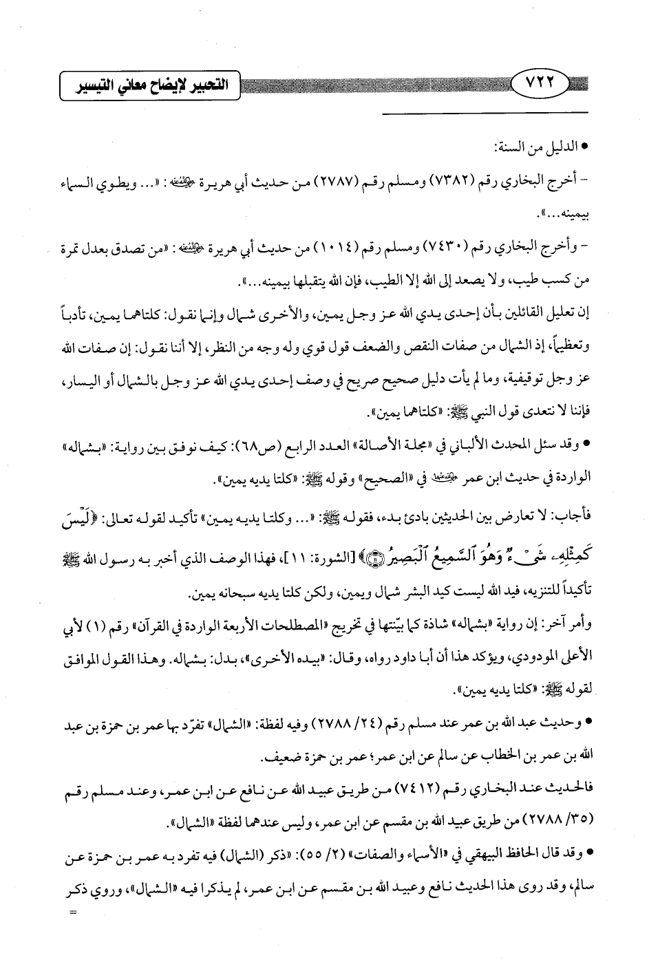 وأمر آخر: إن رواية "بشماله" شاذة كما بيّنتها في تخريج "المصطلحات الأربعة الواردة في القرآن" رقم (1) لأبي الأعلى المودودي، ويؤكد هذا أن أبا داود رواه وقال: "بيده الأخرى"، بدل: بشماله. وهذا القول الموافق لقوله - صلى الله عليه وسلم -:"كلتا يديه يمين".