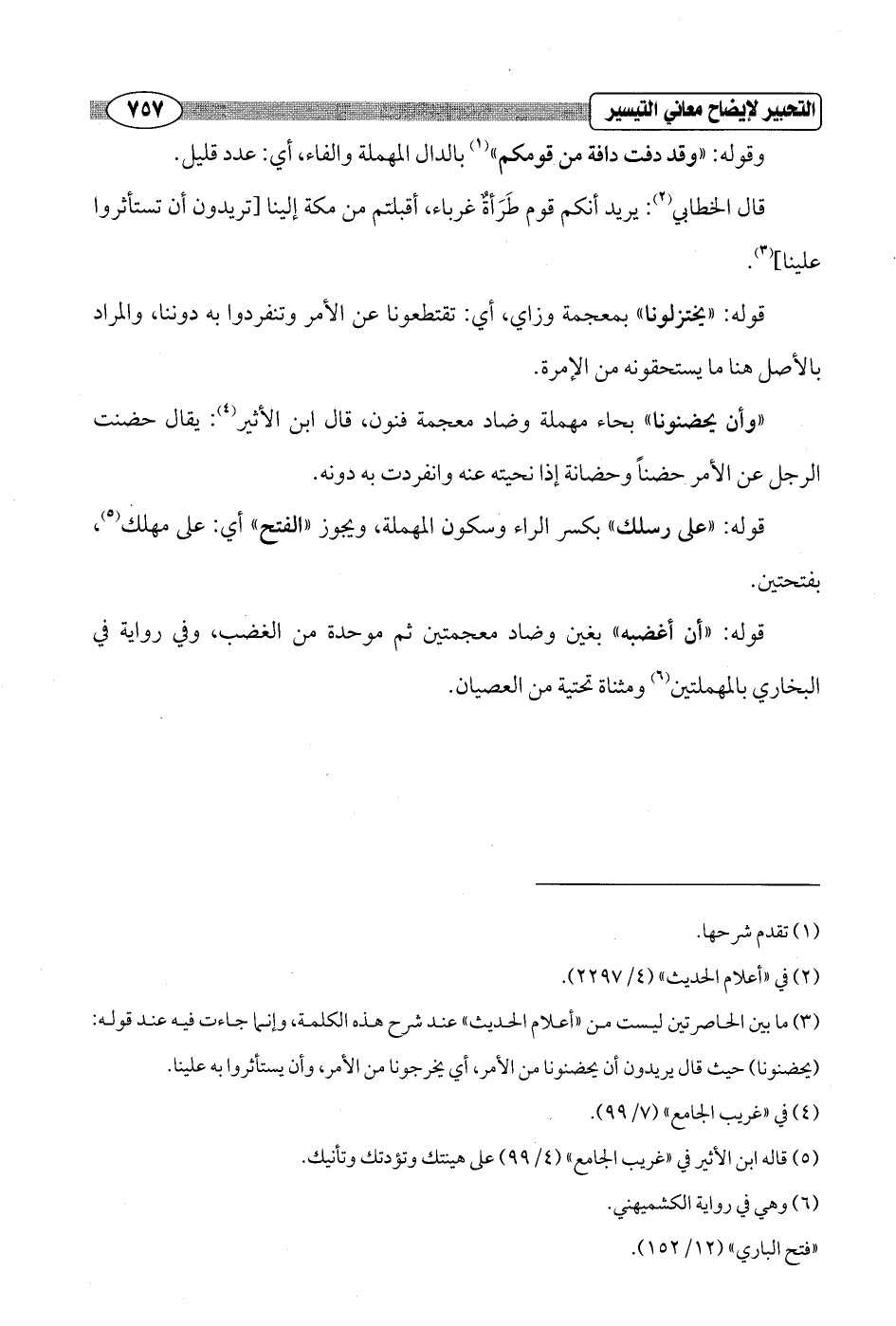 (¬3) ما بين الحاصرتين ليست من "أعلام الحديث" عند شرح هذه الكلمة، وإنما جاءت فيه عند قوله: (يحضنونا) حيث قال يريدون أن يحضنونا من الأمر، أي يخرجونا من الأمر، وأن يستأثروا به علينا.