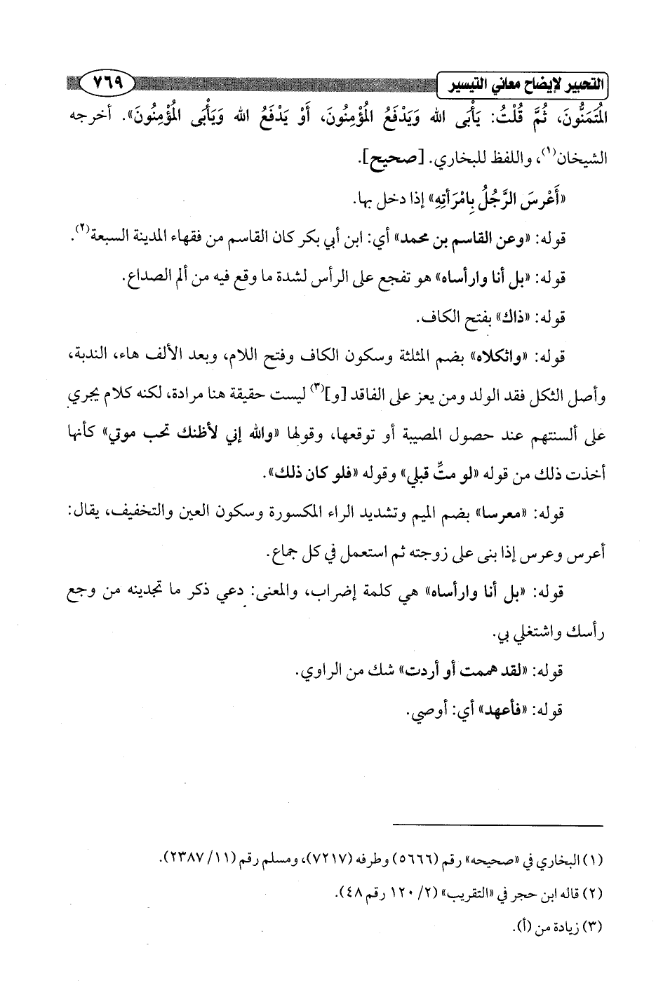 المُتَمَنُّونَ، ثُمَّ قُلْتُ: يَأْبَى الله وَيَدْفَعُ المُؤْمِنُونَ، أَوْ يَدْفَعُ الله وَيَأْبَى المُؤْمِنُونَ". أخرجه الشيخان (¬1)، واللفظ للبخاري. [صحيح].