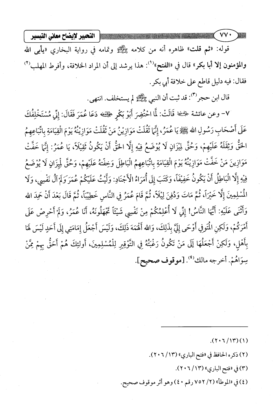 7 - وعن عائشة - رضي الله عنها - قَالَتْ: لمَّا احْتُضِرَ أوْ بَكْرٍ - رضي الله عنه - دَعَا عُمَرَ فَقَالَ: إِنِّي مُسْتَخْلِفُكَ عَلَى أَصْحَابِ رَسُولِ الله - صلى الله عليه وسلم - يَا عُمَرُ، إِنَّمَا ثَقُلَتْ مَوَازِيْنُ مَنْ ثَقُلَتْ مَوَازِيْنُهُ يَوْمَ الْقِيَامَةِ بِاتباعِهِمُ الحَقُّ وَثقَلَهُ عَلَيْهِمْ، وَحُقَّ لِميْزَانٍ لَا يُوْضَعُ فِيْهِ إِلَّا الحَقُّ أَنْ يَكُونُ ثَقِيْلَاً، يَا عُمَرُ: إِنَّمَا خَفَّتْ مَوَازِينَ مَنْ خَفَّتْ مَوَازِيْنُهُ يَوْمَ الْقِيَامَةِ بِاتَّبَاعِهِمُ الْبَاطِلَ وَخِفّتهُ عَلَيْهِمْ، وَحُقَّ لميِزَانٍ لَا يُوْضَعُ فِيْهِ إِلَّا الْبَاطِلُ أَنْ يَكُونُ خَفِيْفَاً، وَكَتَبَ إِلَى أُمَرَاءُ الْأَجْنَادِ: وَلَّيْتُ عَلَيْكُمْ عُمَرَ وَلَمْ آلُ نَفْسِي، وَلَا المُسْلِمِينَ إِلَّا خَيْرَاً، ثُمَّ مَاتَ وَدُفِنَ لِيْلَاً، ثُمَّ قَامَ عُمَرُ فِي النَّاسِ خَطِيْبَاً، ثُمَّ قَالَ بَعْدَ أَنْ حَمِدَ الله وَأَثْنَى عَلَيْهِ: أَيُّهَا النَّاسُ! إِنِّي لَا أُعْلِمُكُمْ مِنْ نَفْسِي شَيْئَاً تَجْهَلُونَهُ, أنَّا عُمَرُ، وَلَمْ أَحْرِصْ عَلَى أَمْرَكُمْ، وَلَكِنِ المُتَوفِي أَوْحَى إِلَيَّ بِذَلِكَ، وَالله أَلْهَمَهَ ذَلِكَ، وَلَيْسَ أَجْعَلُ إِمَامَتِي إِلَى أَحَدٍ لَيْسَ لَهَا بِأَهْلٍ، وَلَكِنْ أَجْعَلُهَا إَلَى مَنْ تَكُونُ رَغْبَتُهُ في التَّوْقِيرِ لِلْمُسْلِمِينَ، أَولئِكَ هُمْ أَحَقُّ بِهِمْ مِمَّنْ سِوَاهُمْ. أخرجه مالك (¬4). [موقوف صحيح].