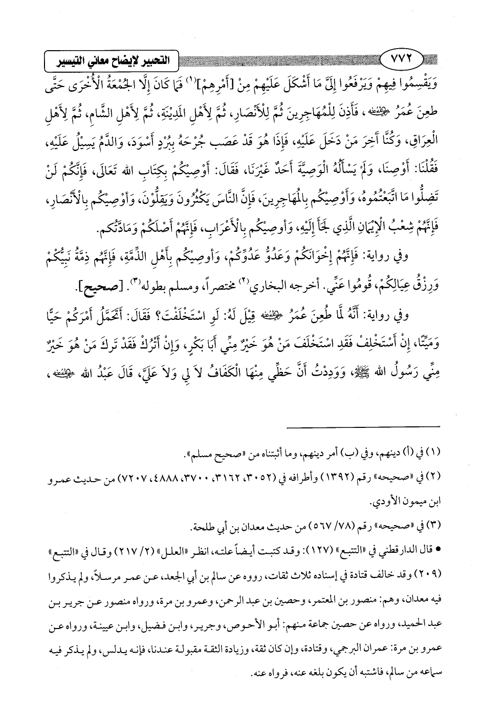 وَيَقْسِمُوا فِيهِمْ وَيرْفَعُوا إِلَىَّ مَا أَشْكَلَ عَلَيْهِمْ مِنْ [أَمْرِهِمْ] (¬1) فَمَا كَانَ إِلَّا الجُمْعَةُ الْأُخْرَى حَتَّى طعِنَ عُمَرُ - رضي الله عنه -، فَأَذِنَ لِلْمُهَاجِرِينَ ثُمَّ لِلْأَنْصَارِ، ثُمَّ لِأَهْلِ المَدِيْنَةِ، ثُمَّ لِأَهْلِ الشَّامِ، ثُمَّ لِأَهْلِ الْعِرَاقِ، وَكُنَّا آَخِرَ مَنْ دَخَلَ عَلَيْهِ، فَإِذَا هُوَ قَدْ عَصَب جُرْحَهُ بِبُرْدٍ أَسْوَدَ، وَالدَّمُ يَسِيْلُ عَلَيْهِ، فَقُلْنَا: أَوْصِنَا، وَلَمْ يَسْأَلُهُ الْوَصِيَّةَ أَحَدٌ غَيْرَنَا، فَقَالَ: أَوْصِيْكُمْ بِكِتَابِ الله تَعَالَى، فَإِنَّكُمْ لَنْ تَضِلُّوا مَا اتَّبَعْتُمُوه, وَأَوْصِيْكُم بِالمُهَاجِرِينَ، فَإِنَّ النَّاسَ يَكْثُرُونَ وَيَقِلُّوْنَ، وَأوْصِيْكُم بِالْأَنْصَارِ، فَإِنَّهُمْ شِعْبُ الْإِيمانِ الَّذِي لَجَأَ إِلَيْهِ، وَأوصِيْكُم بِالْأَعْرَابِ، فَإِنَّهُمْ أَصْلَكُمْ وَمَادَّتُكم.