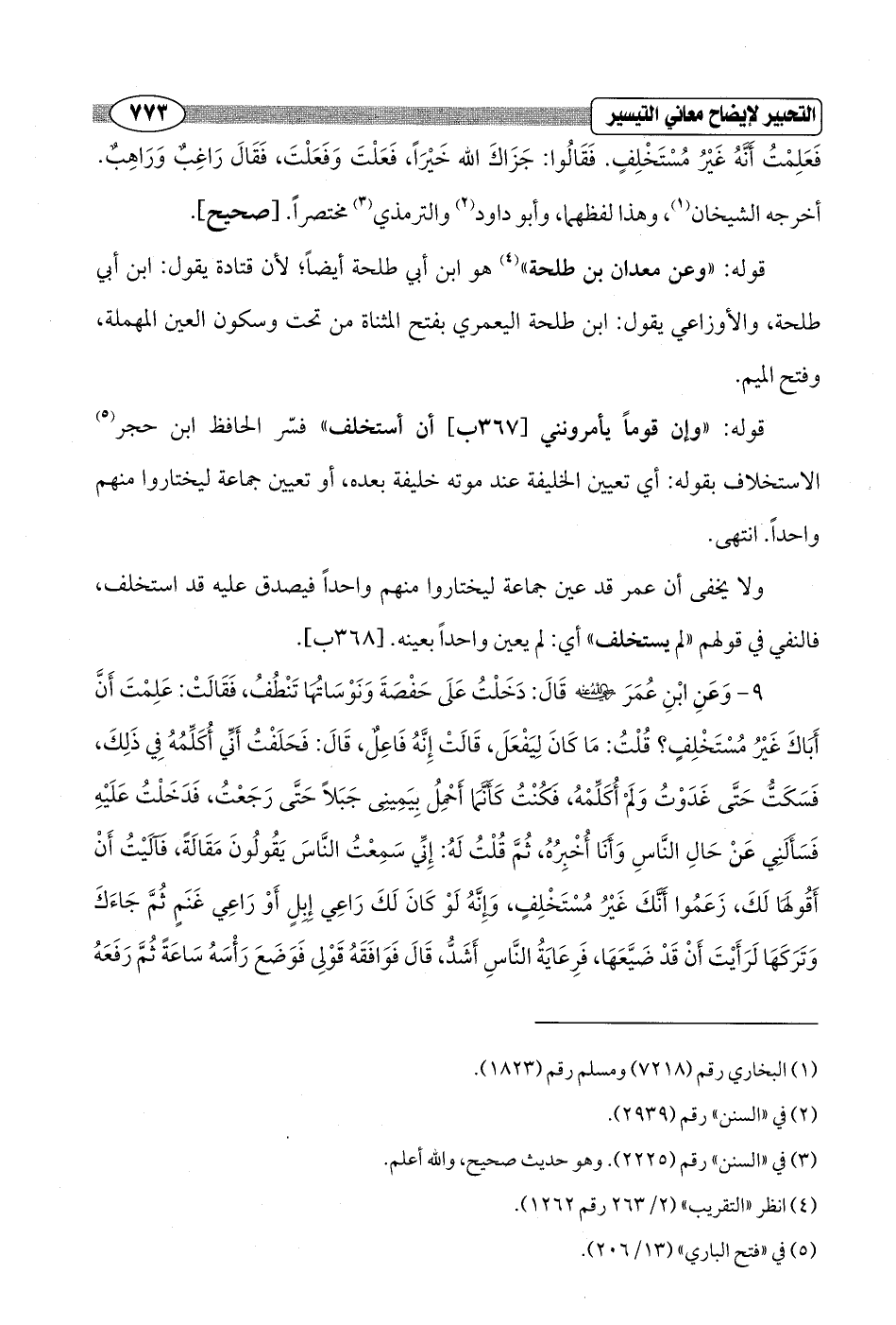 ولا يخفى أن عمر قد عين جماعة ليختاروا منهم واحداً فيصدق عليه قد استخلف، فالنفي في قولهم "لم يستخلف" أي: لم يعين واحداً بعينه. [368 ب].
