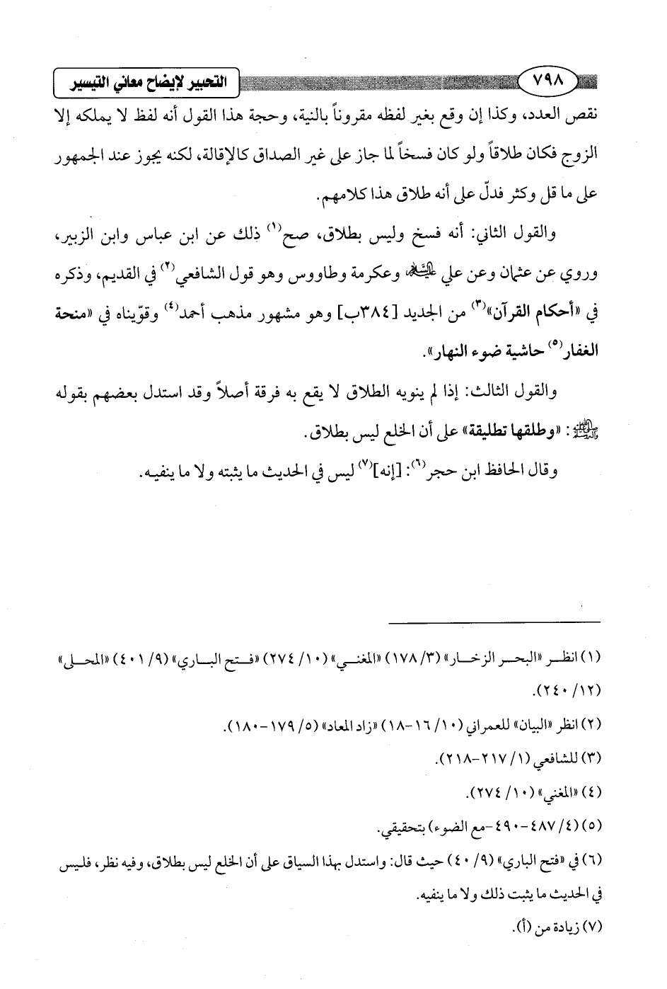 والقول الثاني: أنه فسخ وليس بطلاق، صح (¬1) ذلك عن ابن عباس وابن الزبير، وروي عن عثمان وعن علي - عليه السلام - وعكرمة وطاووس وهو قول الشافعي (¬2) في القديم، وذكره في "أحكام القرآن" (¬3) من الجديد [384 ب] وهو مشهور مذهب أحمد (¬4) وقوّيناه في "منحة الغفار (¬5) حاشية ضوء النهار".