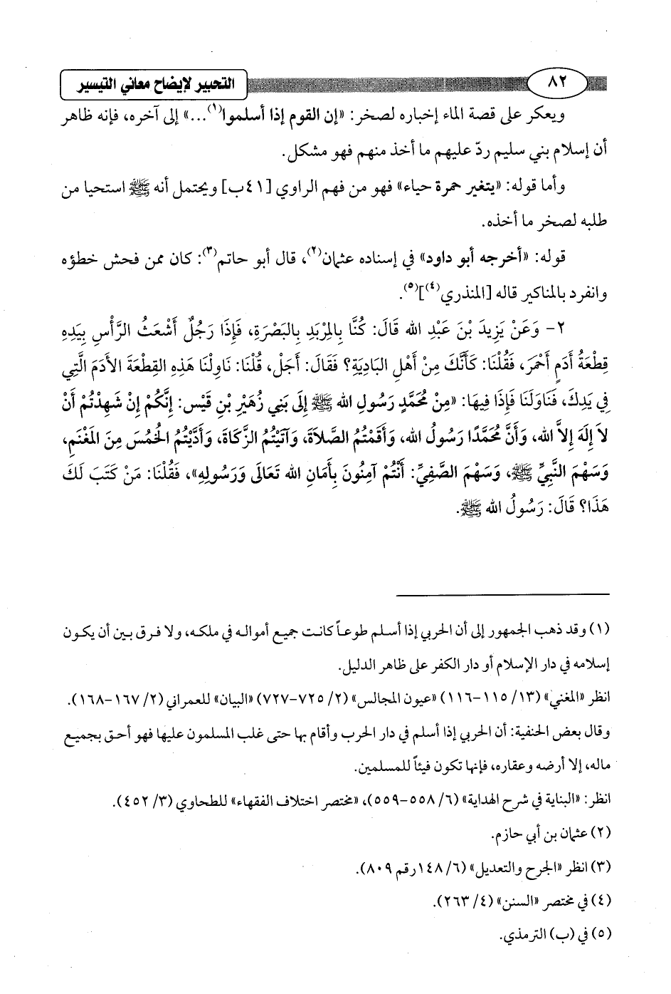 2 - وَعَنْ يَزِيدَ بْنَ عَبْدِ الله قَالَ: كُنَّا بِالمِرْبَدِ بِالبَصْرَةِ، فَإِذَا رَجُلٌ أَشْعَثُ الرَّأْسِ بِيَدِهِ قِطْعَةُ أَدَمٍ أَحْمَرَ، فَقُلْنَا: كَأنَّكَ مِنْ أَهْلِ البَادِيَةِ؟ فَقَالَ: أَجَلْ، قُلْنَا: نَاوِلْنَا هَذِهِ القِطْعَةَ الأَدَمَ الَّتِي فِي يَدِكَ، فَنَاوَلَنَا فَإِذَا فِيهَا: "مِنْ مُحَمَّدٍ رَسُولِ الله - صلى الله عليه وسلم - إِلَى بَنِي زُهَيْرِ بْنِ قَيْس: إِنَّكُمْ إِنْ شَهِدْتُمْ أَنْ لاَ إِلَهَ إِلاَّ الله، وَأَنَّ مُحَمَّدًا رَسُولُ الله، وَأَقَمْتُمُ الصَّلاَةَ وَآتيْتُمُ الزَّكَاةَ، وَأَدَّيْتُمُ الخُمُسَ مِنَ المَغْنَمِ، وَسَهْمَ النَّبِيِّ - صلى الله عليه وسلم -، وَسَهْمَ الصَّفِيِّ: أَنْتُمْ آمِنُونَ بِأَمَانِ الله تَعَالَى وَرَسُولهِ"، فَقُلْنَا: مَنْ كَتَبَ لَكَ هَذَا؟ قَالَ: رَسُولُ الله - صلى الله عليه وسلم -.