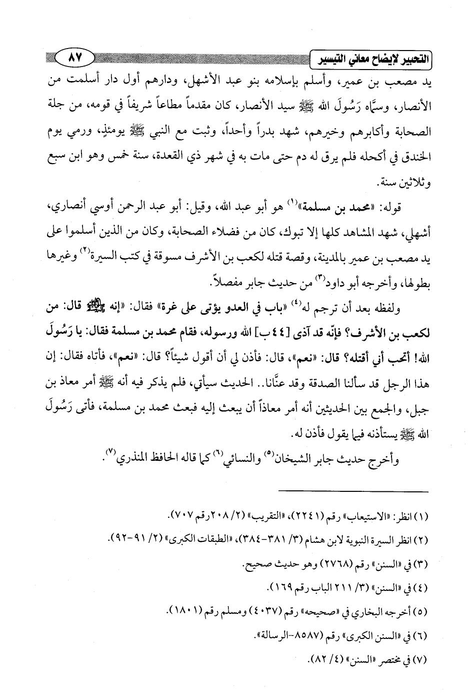 قوله: "محمد بن مسلمة" (¬1) هو أبو عبد الله، وقيل: أبو عبد الرحمن أوسي أنصاري، أشهلي، شهد المشاهد كلها إلا تبوك، كان من فضلاء الصحابة، وكان من الذين أسلموا على يد مصعب بن عمير بالمدينة، وقصة قتله لكعب بن الأشرف مسوقة في كتب السيرة (¬2) وغيرها بطولها، وأخرجه أبو داود (¬3) من حديث جابر مفصلاً.