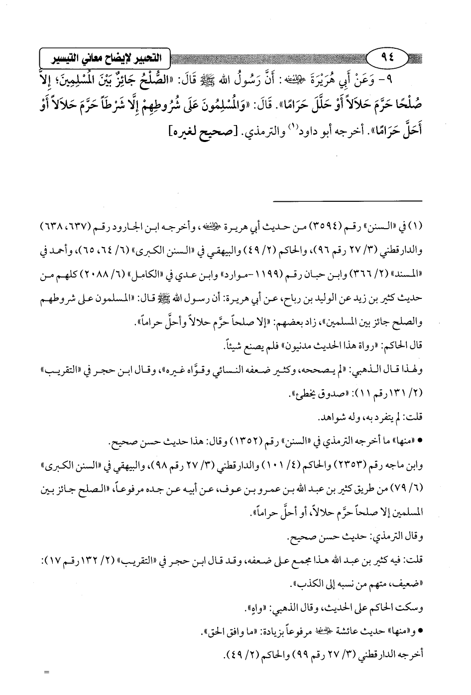 (¬1) في "السنن" رقم (3594) من حديث أبي هريرة - رضي الله عنه -، وأخرجه ابن الجارود رقم (637، 638) والدارقطني (3/ 27 رقم 96)، والحاكم (2/ 49) والبيهقي في "السنن الكبرى" (6/ 64، 65)، وأحمد في "المسند" (2/ 366) وابن حبان رقم (1199 - موارد) وابن عدي في "الكامل" (6/ 2088) كلهم من حديث كثير بن زيد عن الوليد بن رباح، عن أبي هريرة: أن رسول الله - صلى الله عليه وسلم - قال: "المسلمون على شروطهم والصلح جائز بين المسلمين"، زاد بعضهم: "إلا صلحاً حرَّم حلالاً وأحلَّ حراماً".