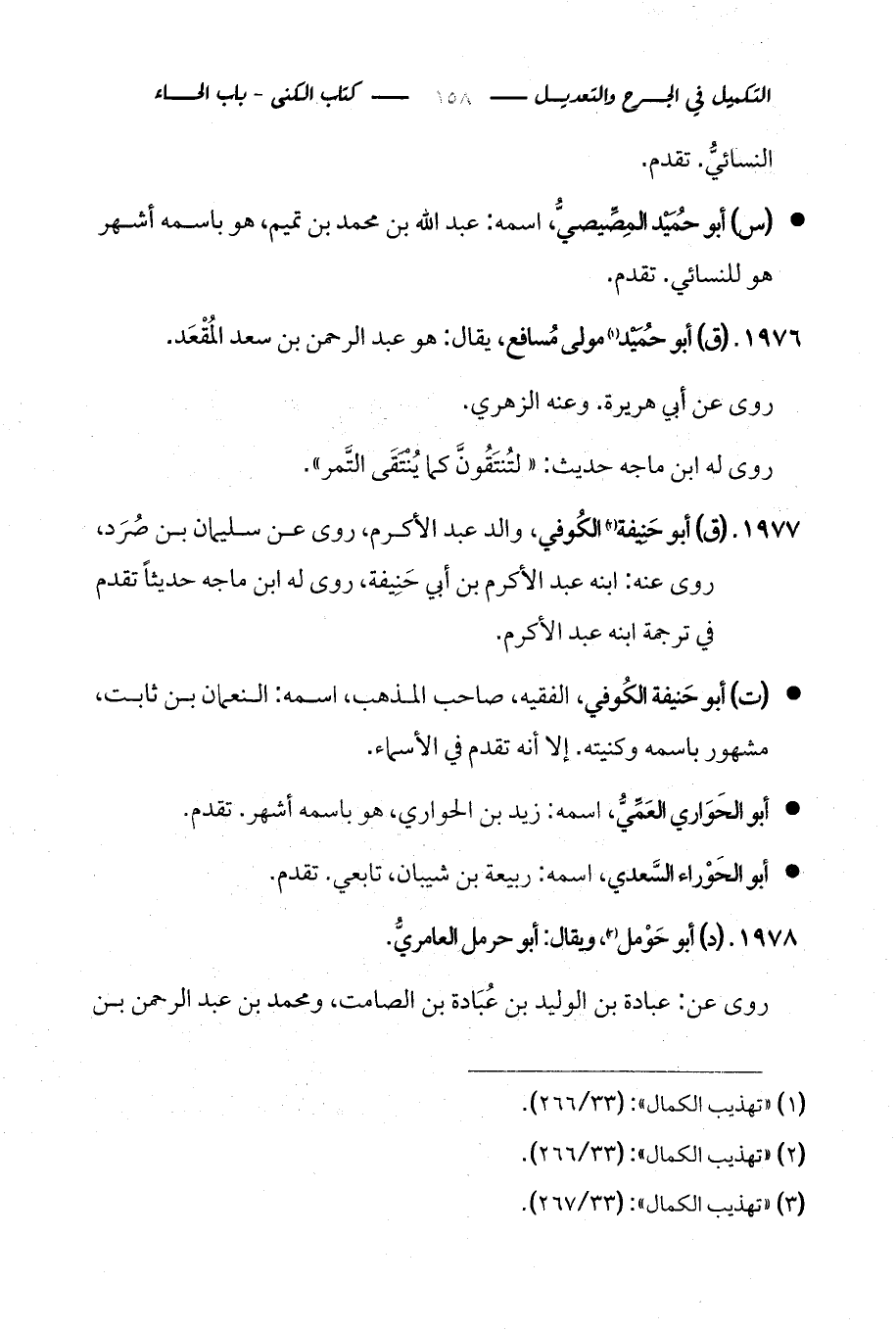 - (ت) أبو حَنيفة الكُوفي، الفقيه، صاحب المذهب، اسمه: النعمان بن ثابت، مشهور باسمه وكنيته. إلا أنه تقدم في الأسماء.