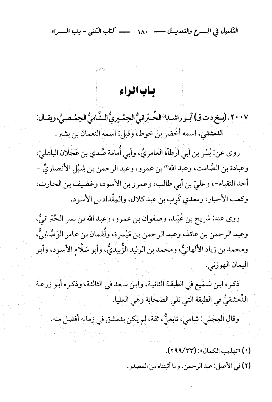 2007 - (بخ د ت ق) أبو راشد (¬1) الحُبْرانيُّ الحِمْيريُّ الشَّاميُّ الحِمْصيُّ، ويقال: الدمشقي، اسمه أخْضر بن خوط، وقيل: اسمه النعمان بن بشير.