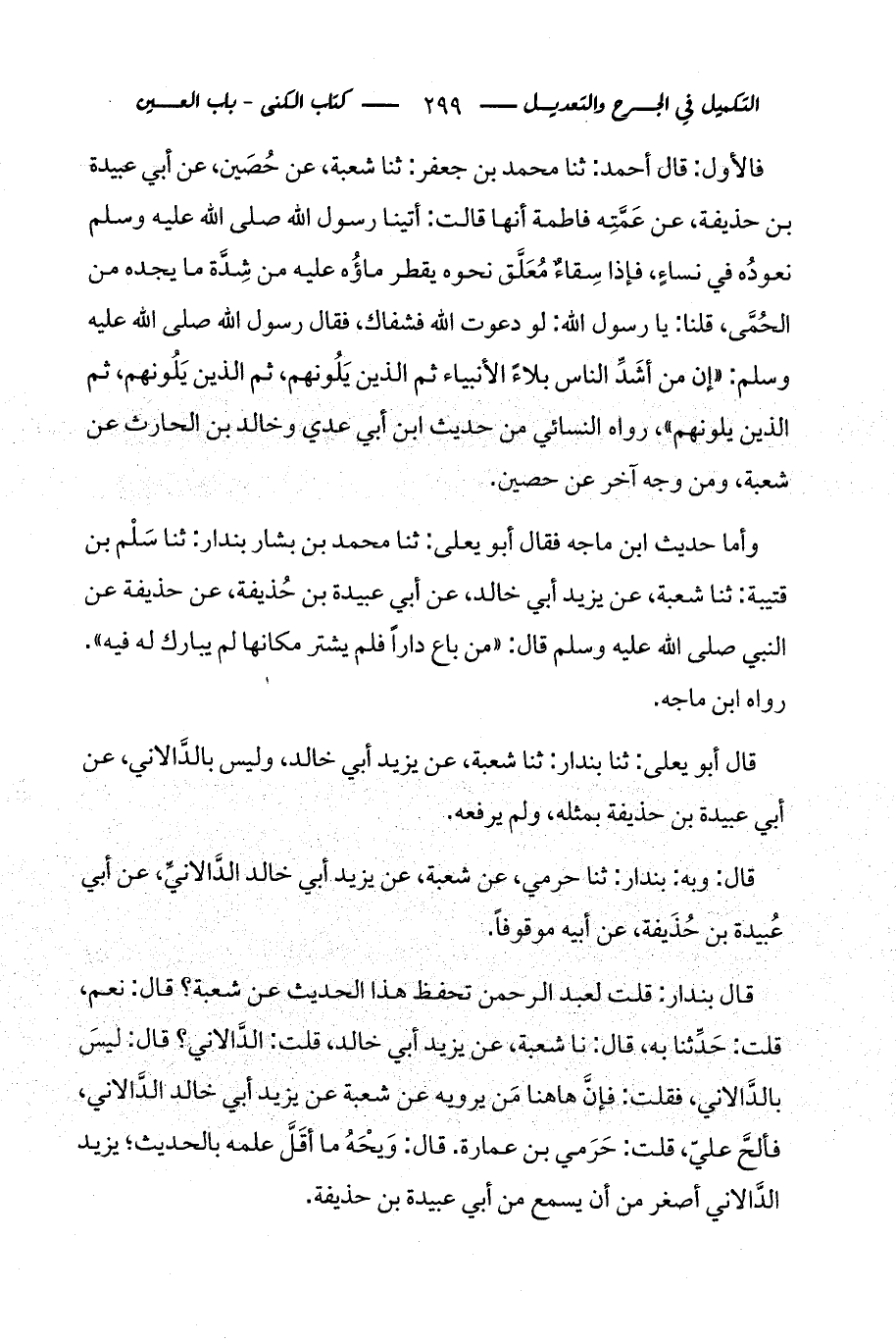 فالأول: قال أحمد: ثنا محمد بن جعفر: ثنا شعبة، عن حُصَين، عن أبي عبيدة بن حذيفة، عن عَمَّتِه فاطمة أنها قالت: أتينا رسول الله صلى الله عليه وسلم نعودُه في نساءٍ، فإذا سِقاءٌ مُعَلَّق نحوه يقطر ماؤُه عليه من شِدَّة ما يجده من الحُمَّى، قلنا: يا رسول الله: لو دعوت الله فشفاك، فقال رسول الله صلى الله عليه وسلم: «إن من أشَدِّ الناس بلاءً الأنبياء ثم الذين يَلُونهم، ثم الذين يَلُونهم، ثم الذين يلونهم»، رواه النسائي من حديث ابن أبي عدي وخالد بن الحارث عن شعبة، ومن وجه آخر عن حصين.