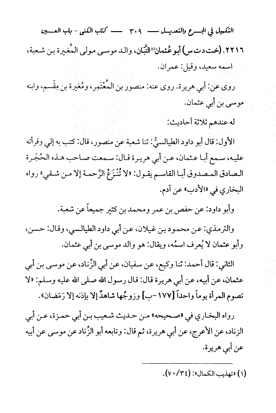 2216 - (خت د ت س) أبو عُثمان (¬1) التَّبّان، والد موسى مولى المُغيرة بن شعبة، اسمه سعيد، وقيل: عمران.