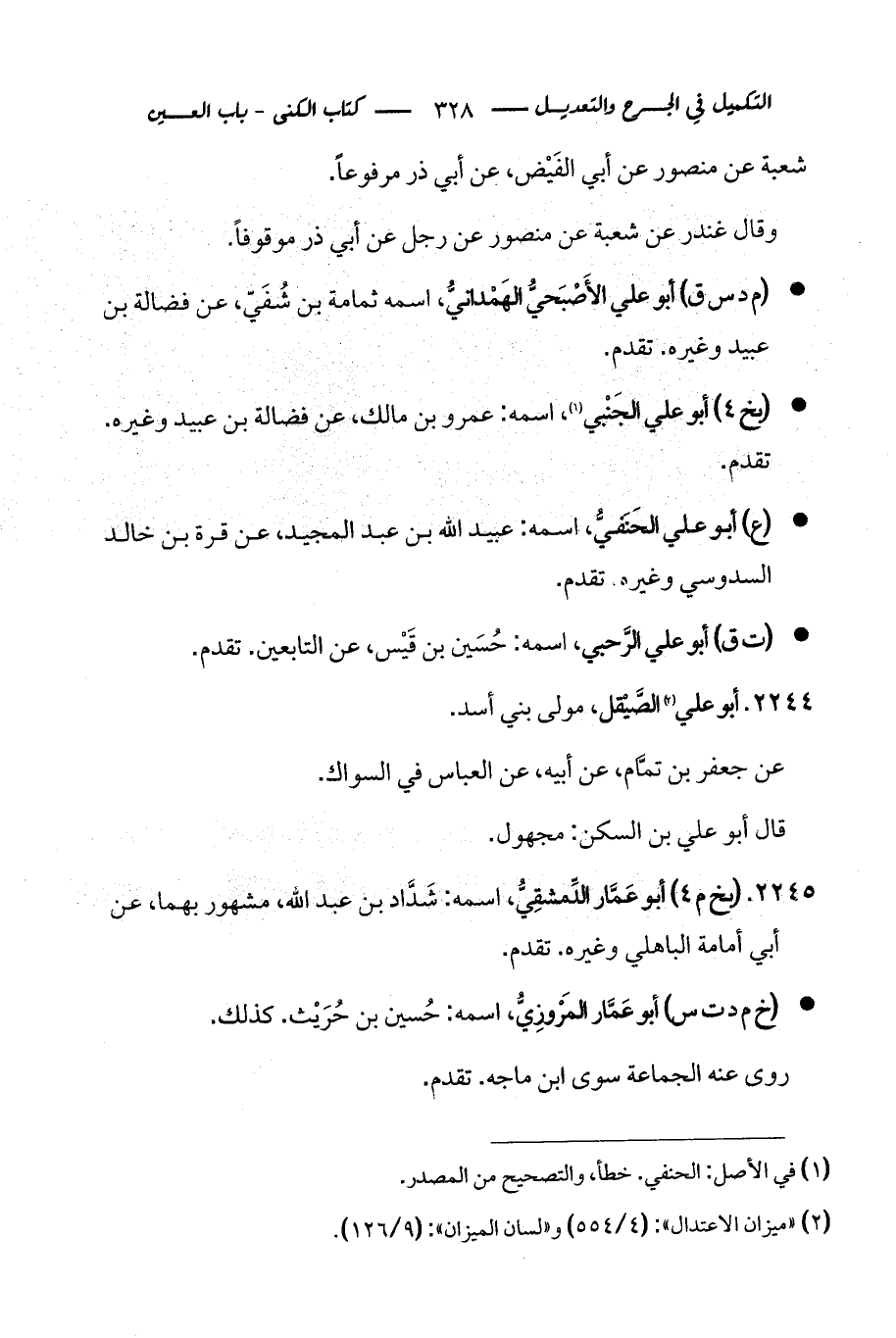 - (ع) أبو علي الحَنَفيُّ، اسمه: عبيد الله بن عبد المجيد، عن قرة بن خالد السدوسي وغيره. تقدم.