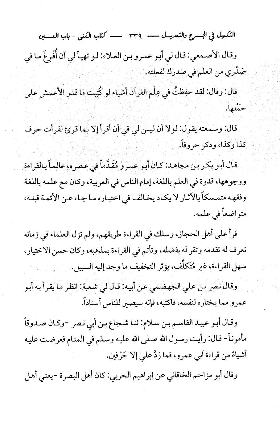 قال أبو بكر بن مجاهد: كان أبو عمرو مُقَدَّماً في عصره، عالماً بالقراءة ووجوهها، قدوة في العلم باللغة، إمام الناس في العربية، وكان مع علمه باللغة وفقهه متمسكاً بالآثار لا يكاد يخالف في اختياره ما جاء عن الأئمة قبله، متواضعاً في علمه.