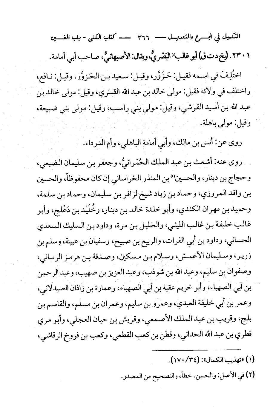 2301 - (بخ د ت ق) أبو غالب (¬1) البَصْريُّ، ويقال: الأصبهانيُّ، صاحب أبي أمامة.