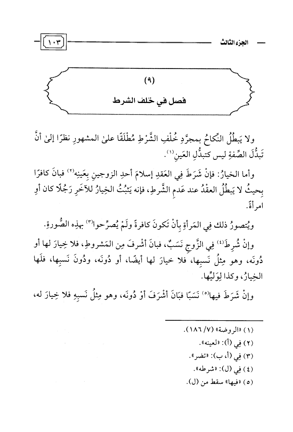 وإنْ شُرِطَ (¬4) فِي الزَّوجِ نَسَبٌ، فبانَ أشْرفَ مِن المَشروطِ، فلا خِيارَ لها أو دُونَه، وهو مِثلُ نَسبِها، فلا خيارَ لها أيضًا، أو دُونَه، ودُونَ نَسبِها، فلَها الخِيارُ، وكذا لِوَليِّها.