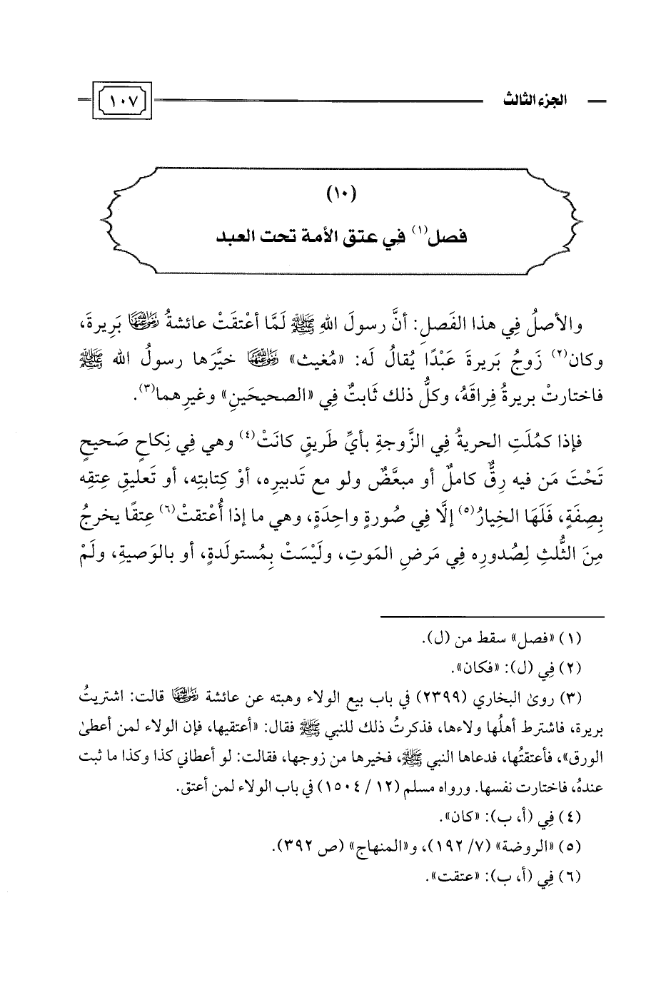 (¬3) روى البخاري (2399) في باب بيع الولاء وهبته عن عائشة -رضي اللَّه عنها- قالت: اشتريتُ بريرة، فاشترط أهلُها ولاءها، فذكرتُ ذلك للنبي -صلى اللَّه عليه وسلم- فقال: "أعتقيها، فإن الولاء لمن أعطى الورق"، فأعتقتُها، فدعاها النبي -صلى اللَّه عليه وسلم-، فخيرها من زوجها، فقالت: لو أعطاني كذا وكذا ما ثبت عندهُ، فاختارت نفسها. ورواه مسلم (12/ 1504) في باب الولاء لمن أعتق.