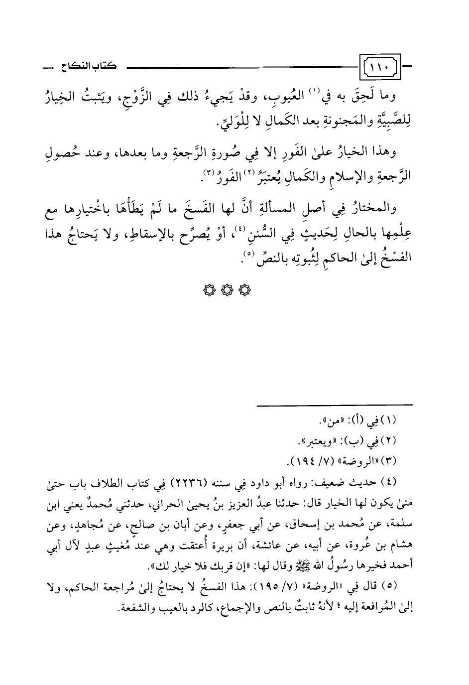 والمختارُ فِي أصلِ المسألةِ أنَّ لها الفَسخَ ما لَمْ يَطَأْهَا باخْتيارِها مع عِلْمِها بالحالِ لِحَديثٍ فِي السُّننِ (¬4)، أوْ يُصرِّح بالإسقاطِ، ولا يَحتاجُ هذا الفسْخُ إلى الحاكمِ لِثُبوتِه بالنصِّ (¬5).
