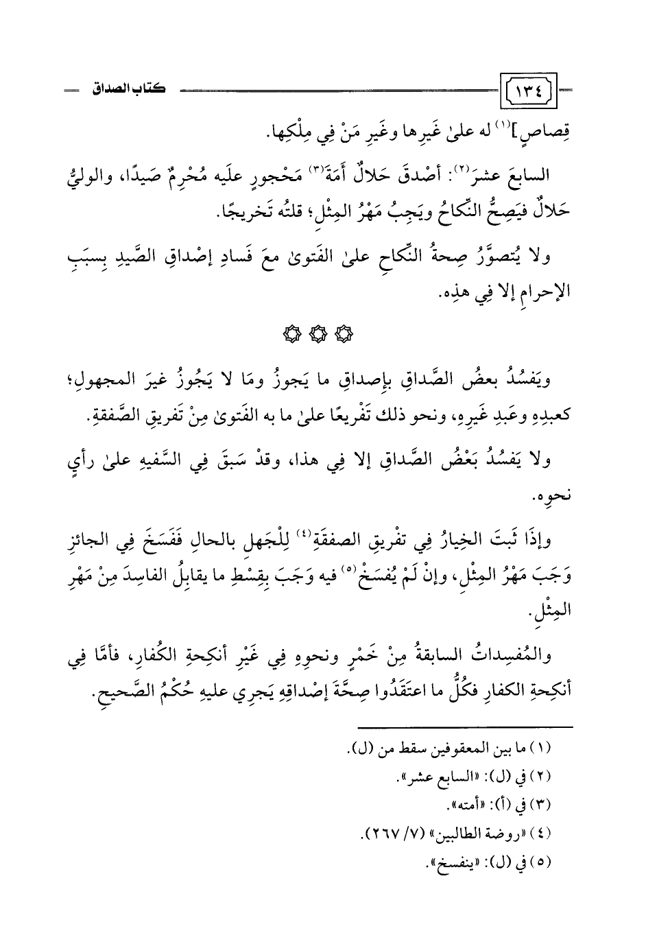 والمُفسِداتُ السابقةُ مِنْ خَمْرٍ ونحوِهِ فِي غَيْرِ أنكِحةِ الكُفارِ، فأمَّا فِي أنكِحةِ الكفارِ فكُلُّ ما اعتَقَدُوا صِحَّةَ إصْداقِهِ يَجرِي عليهِ حُكْمُ الصَّحيحِ.