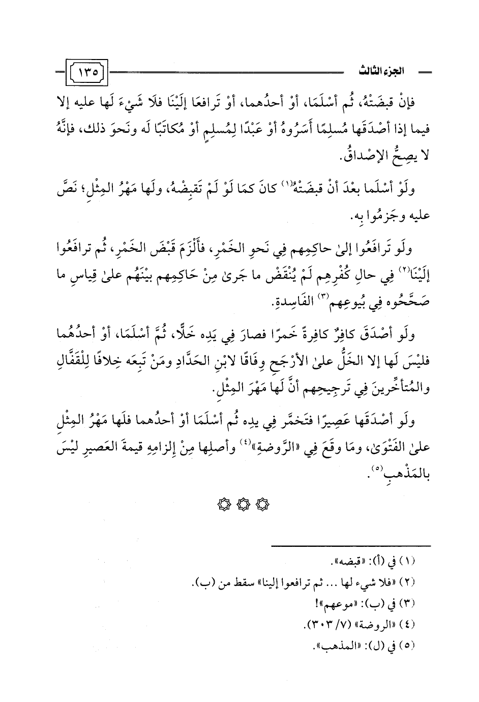 فإنْ قبضَتْهُ، ثُم أسْلَمَا، أوْ أحدُهما، أوْ تَرافعَا إلَيْنَا فلَا شَيءَ لَها عليه إلا فيما إذا أصدَقَها مُسلِمًا أَسَرُوهُ أوْ عَبْدًا لِمُسلِمٍ أوْ مُكاتَبًا لَه ونَحوَ ذلك، فإنَّهُ لا يصِحُّ الإصْداقُ.