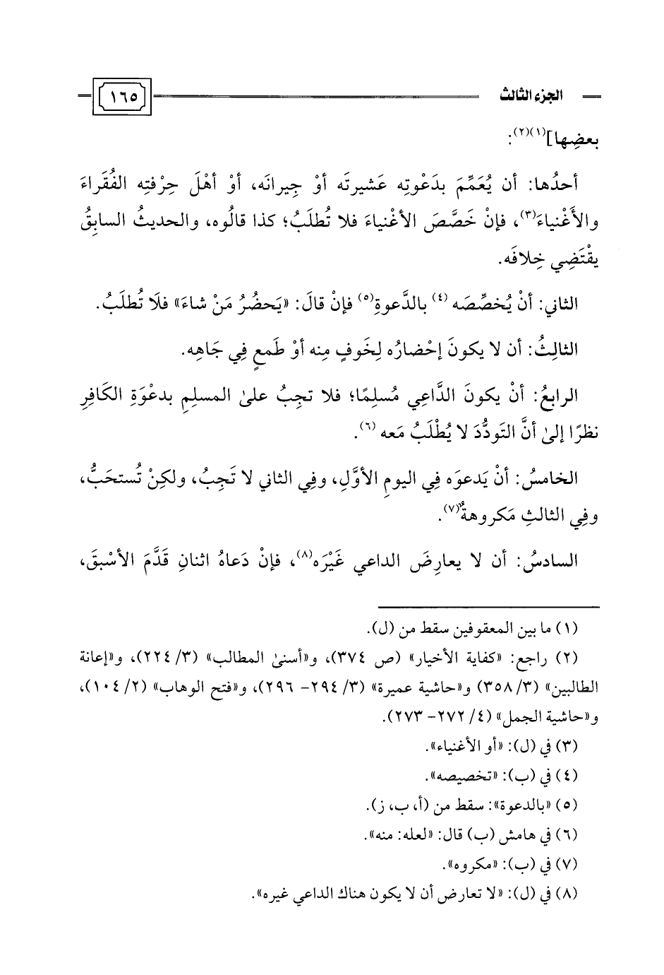 أحدُها: أن يُعَمِّمَ بدَعْوتِه عَشيرتَه أوْ جِيرانَه، أوْ أهْلَ حِرْفتِه الفُقَراءَ والأَغْنياءَ (¬3)، فإنْ خَصَّصَ الأغْنياءَ فلا تُطلَبُ؛ كذا قالُوه، والحديثُ السابِقُ يقْتَضِي خِلافَه.