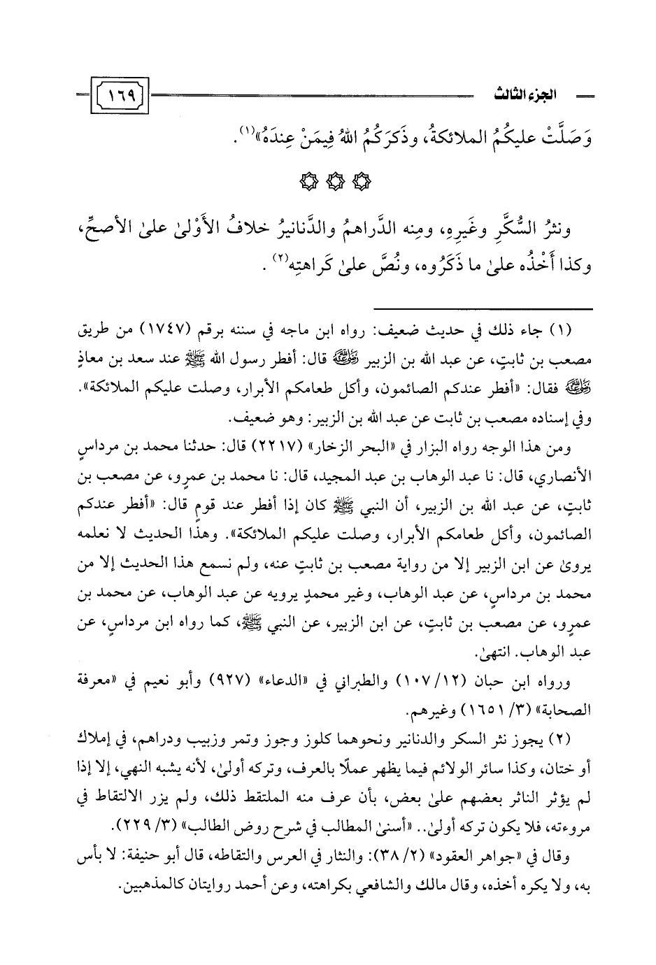 ونثرُ السُّكَّرِ وغَيرِهِ، ومِنه الدَّراهمُ والدَّنانيرُ خلافُ الأَوْلى على الأصحِّ، وكذا أَخْذُه على ما ذَكَرُوه، ونُصَّ على كَراهتِه (¬2).
