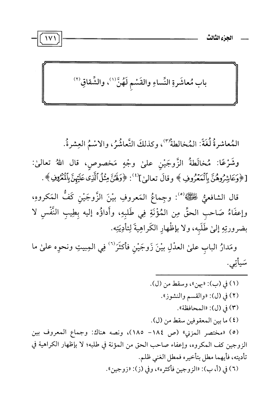 (¬5) "مختصر المزني" (ص 184 - 185)، ونصه هناك: وجماع المعروف بين الزوجين كف المكروه، وإعفاء صاحب الحق من المؤنة في طلبه، لا بإظهار الكراهية في تأديته، فأيهما مطل بتأخيره فمطل الغني ظلم.