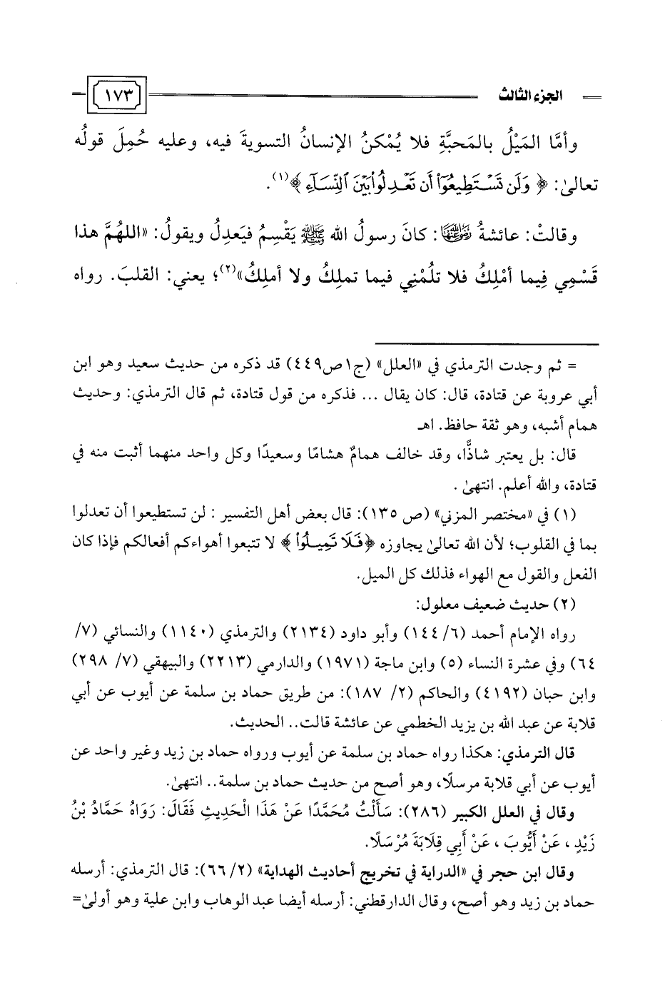 وقالتْ: عائشةُ -رضي اللَّه عنها-: كانَ رسولُ اللَّه -صلى اللَّه عليه وسلم- يَقْسِمُ فيَعدِلُ ويقولُ: "اللهُمَّ هذا قَسْمِي فِيما أمْلِكُ فلا تلُمْنِي فيما تملِكُ ولا أملِكُ" (¬2)؛ يعني: القلبَ. رواه